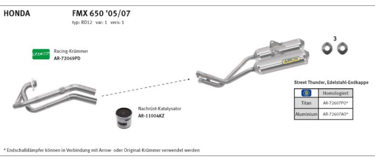 Zum Krümmer gibt es auch den Kat. Lt. Beschreibung ist der Auspuff mit dem Krümmer ohne Kat nicht zulässig. Ich würde bei Arrow nachfragen ob es in Verbindung mit dem Kat eintragungsfähig ist.