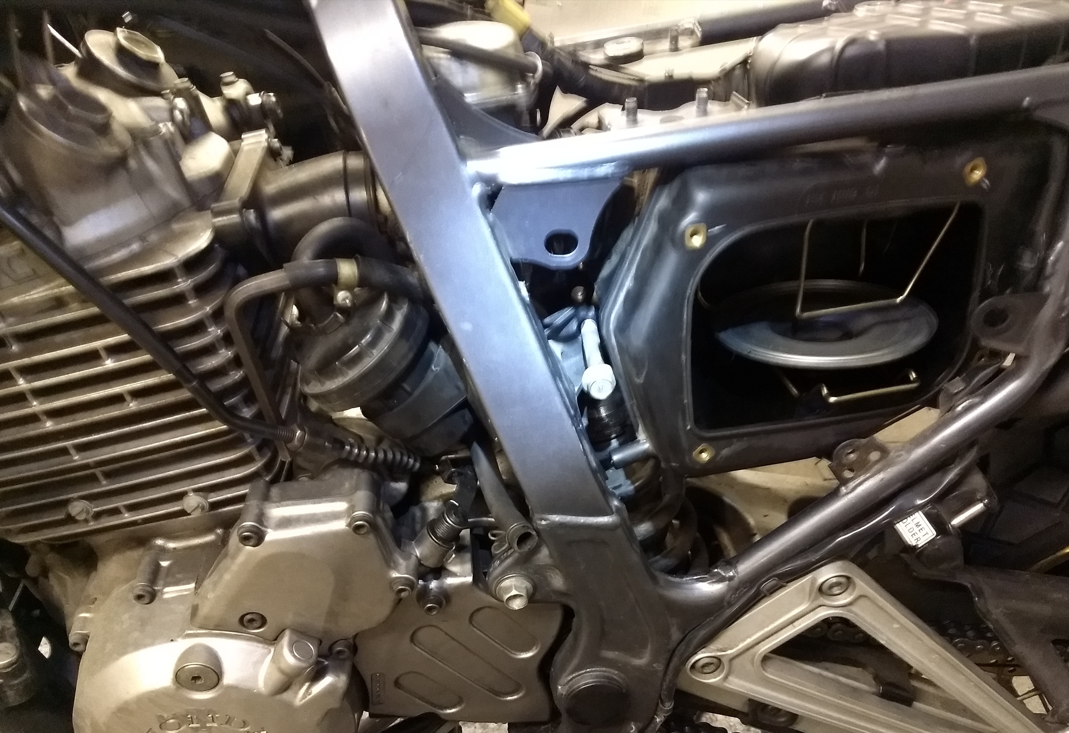 Beim einbauen muss der Luftfilterkasten ein ganzes Stück zurück, da man sonst die obere Schraube des Federbeins nicht raus bekommt. Diese muss dann von rechts wieder (so soll es sein) eingebaut werden. Im Original ist die verkehrt herum drin. Das YSS sieht 700g weniger als das originale. Ich hab mir bei der Gelegenheit einen Schutz für das Teil besorgt und angepasst (von Acerbis, aus dem Dr-Big-Shop bestellt). Diesen hab ich am Luftfilterkasten verschraubt (zwei Schrauben mit selbstsichernden Muttern).