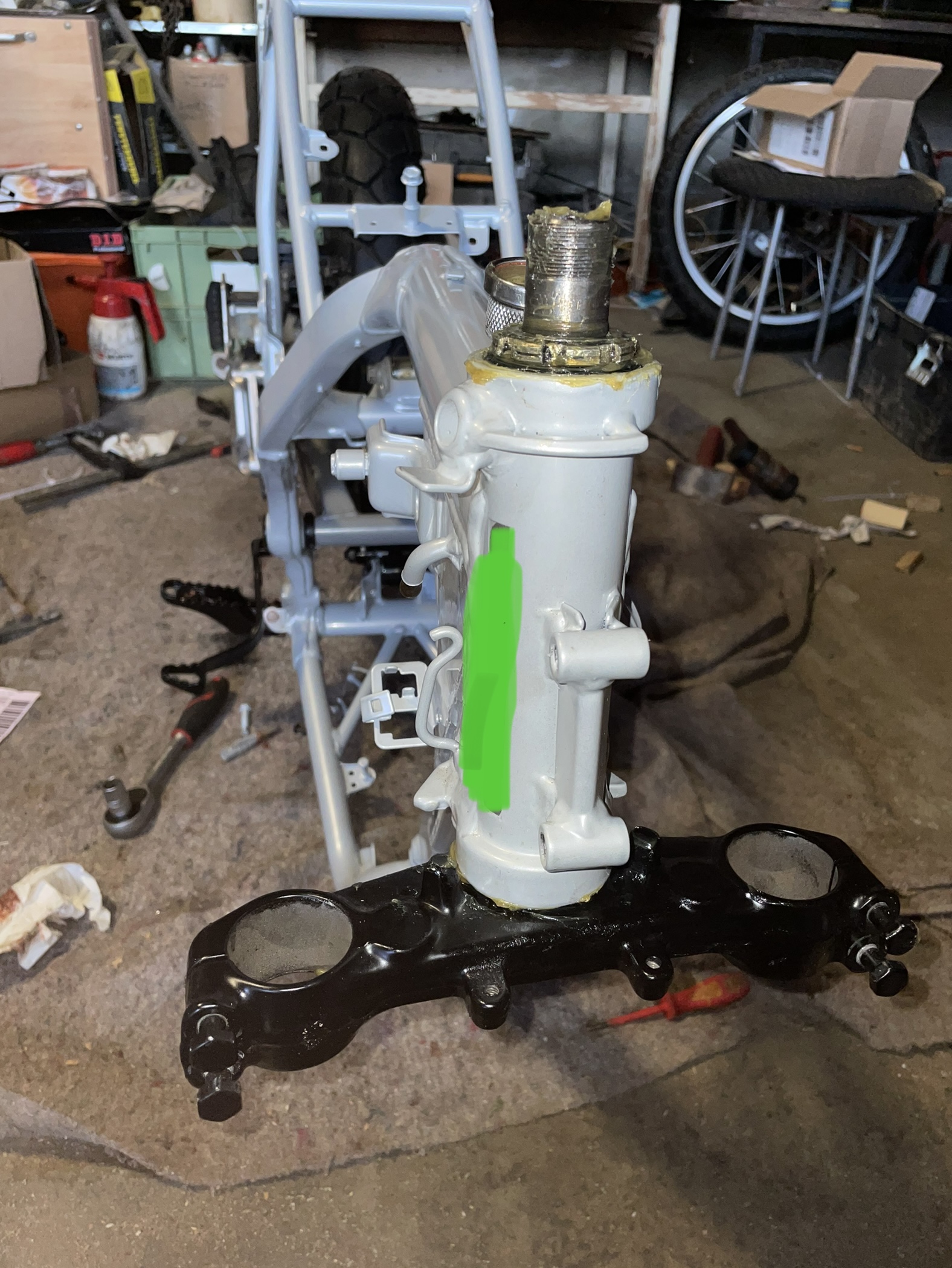 Irgendwann wurde dann auch klar, dass es sich um einen regulären RD08-Rahmen handelt, bei dem Motor um einen RD08-34PS-Motor, beim Vergaser um einen RD08-44PS-Vergaser und bei einem der beiden Zylinder um einen NX650-Zylinder (ein weiteren XR gibt es noch). Ja, sonst sind auch einige Teile durcheinandergewürfelt. Der Motor sah ok aus, Zylinder jedoch hinüber und Kolben sowie Ventildeckel gar nicht dabei. Was in den letzten Monaten (komprimiert) dann passiert ist: