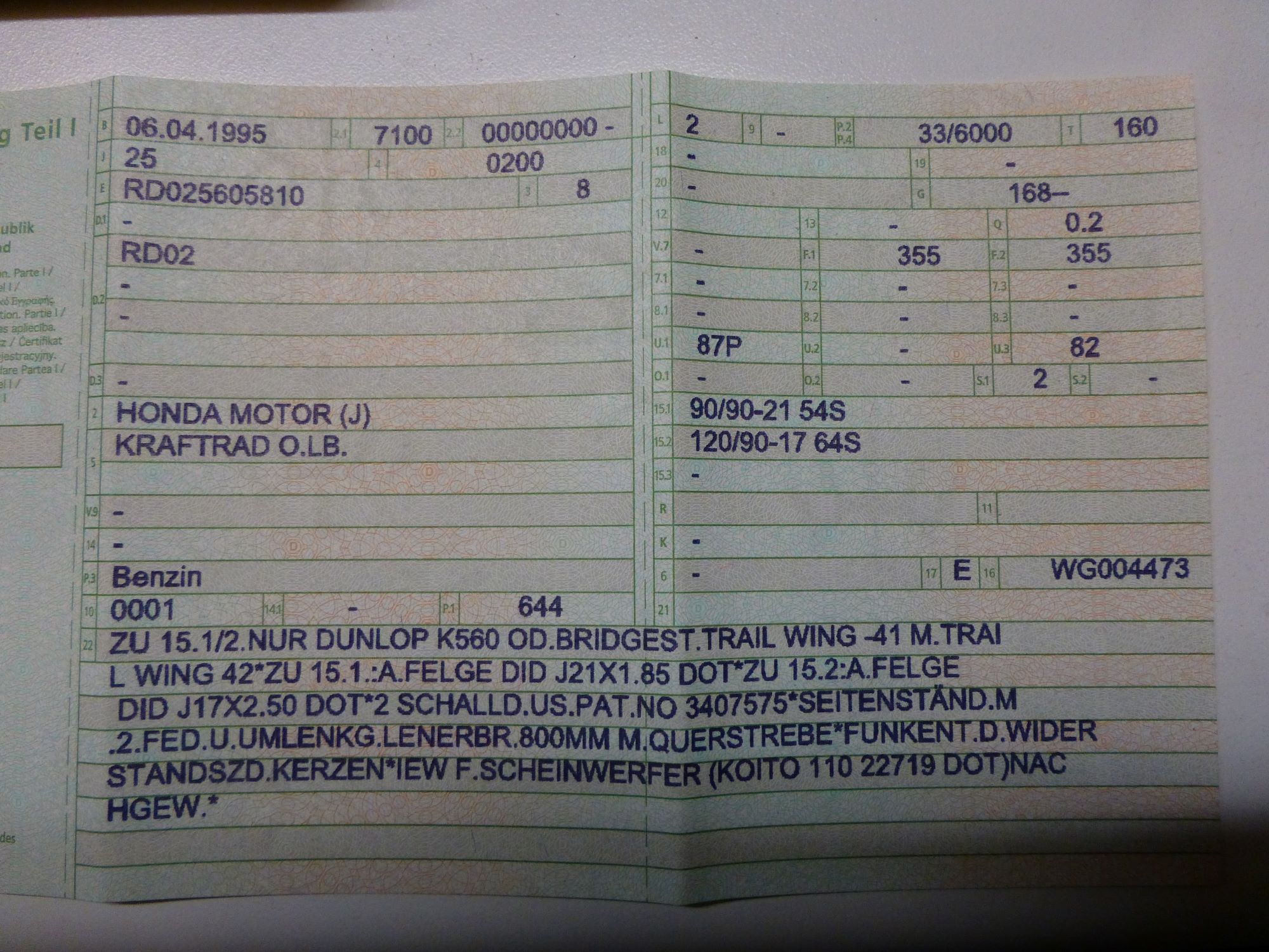 Geändert ist erstmal gar nichts. Er sagte, er könne mir die Zeile mit den Reifenbindungen (Dunlop, Bridgestone) zwar löschen, aber er müßte auch die originalen Reifengrößen austragen und die jetzt montierten Reifengrößen dafür eintragen. Und wenn ich wieder einen 120er Hinterreifen fahren will, würde der wieder eingetragen und der 130er ausgetragen. Häääää????