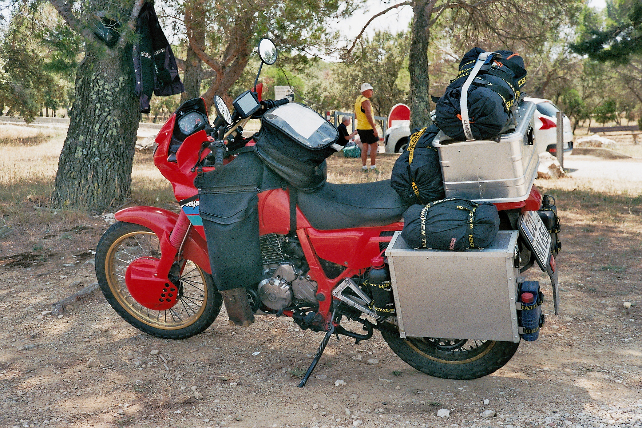 NX650 RD02 1993 Cyclone Blue Metallic: SLS Off, Metzeler Enduro 3, SW-Motech HS und Lenkererhöhung 15mm, Wilbers 640, HB TC-Träger, Raximo BCF, Sutton Ölkühler.
