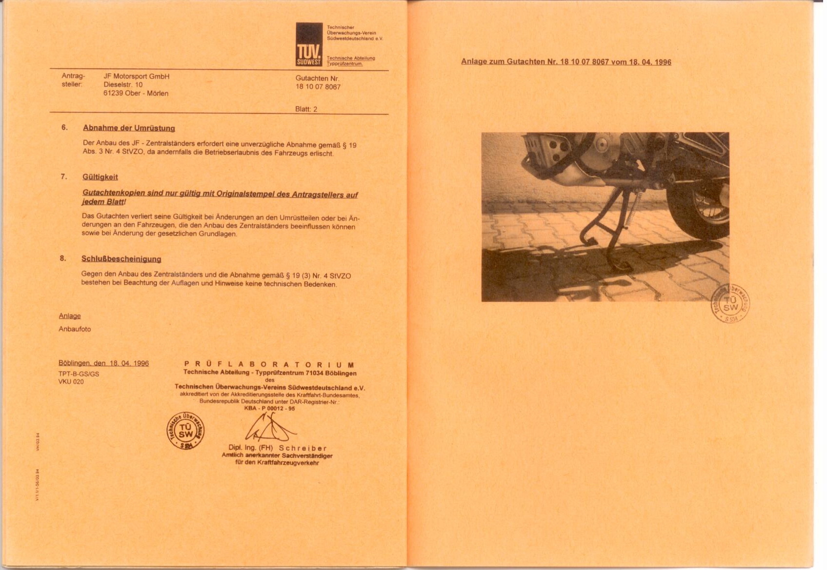 Ich habe einen Five-Stars-Ständer an meiner RD 08 EZ 1998. Das mitgelieferte TÜV-Gutachten stammt von 1996. Die Einbauanleitung nimmt aber Bezug auf die bis 1995 angebotenen Domi-Modelle. Nach dem Einbau stellte ich fest, dass die Maschine zwar mit viel Kraft aufgebockt werden muss, allerdings fast von allein wieder vom Hauptständer rollt. Mit Feilen habe ich den Anschlag so bearbeitet, dass das Runterrollen etwas schwerer geht. Vor dem Festzurren des Gepäcks sichere ich daher den Hauptständer mit einem Spanngurt. Weiteres siehe Bilder!