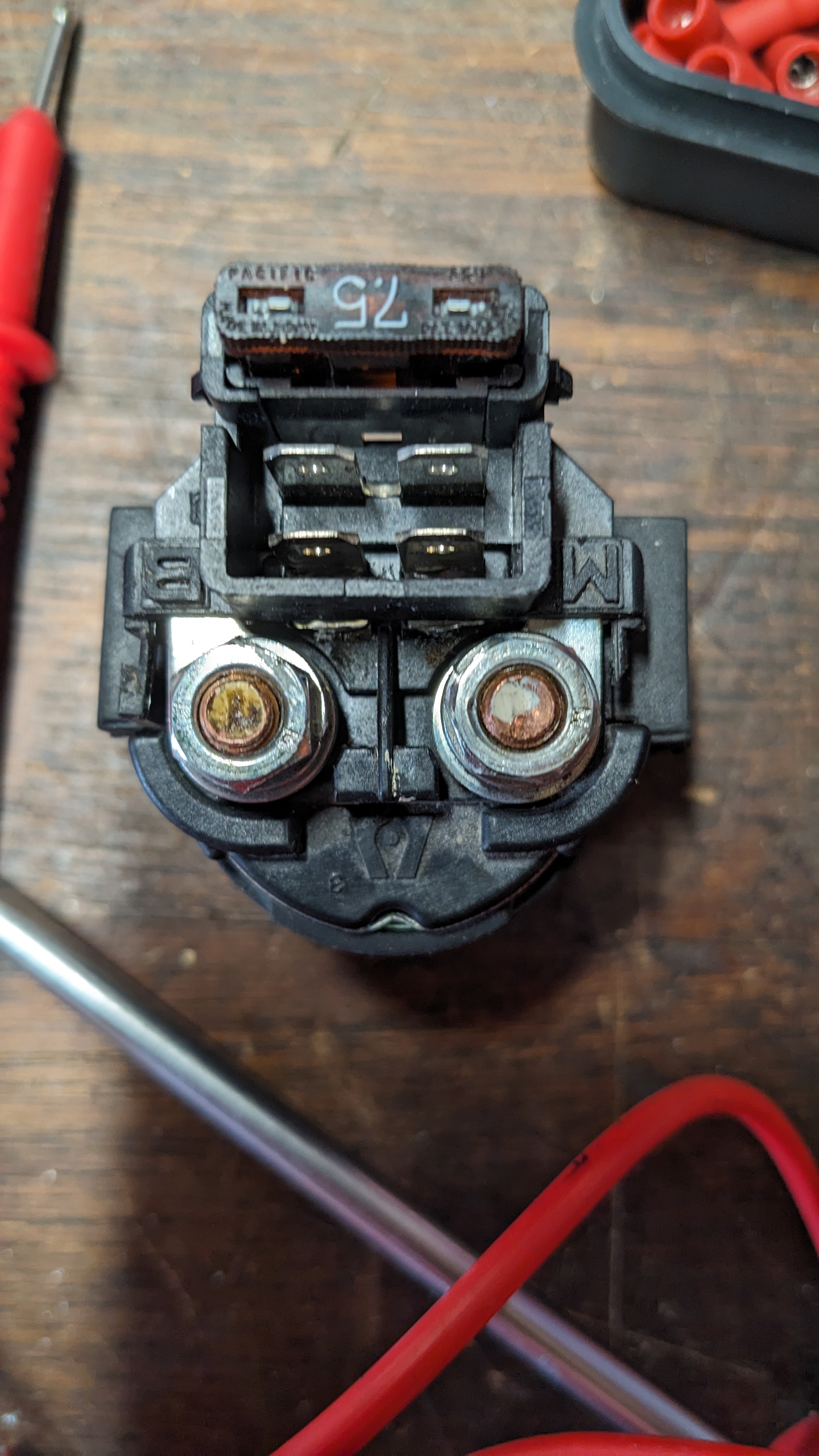 Ich habe mein Starterrelais für meine CRF 230 durchgemessen. Die unteren beiden Pins schalten die Magnetspule die oberen beiden Pins sind verbunden und da habe ich keine Ahnung wofür die sind.