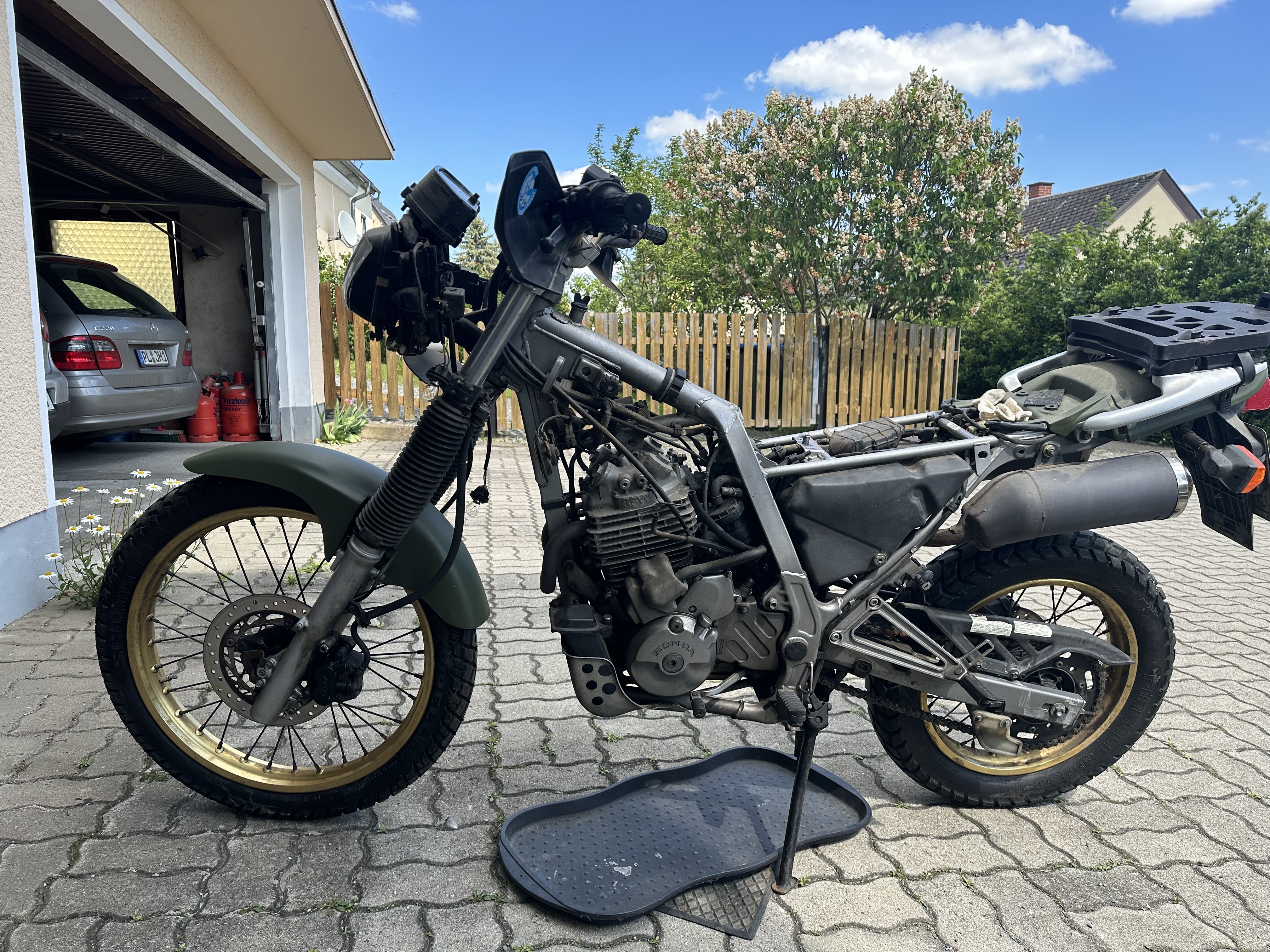 Ja, grün ist die Farbe der Startphase: ad eins, sie trägt ein Militärkleid. Das werden wir ihr ausziehen, Zeitenwende hin oder her, ich fahr mit einem Oldtimer nicht nach Russland. Basta! Ich denke, ich werde sie optisch an die neue Transalp angleichen, also weiß im Grundton, und Streifen im HRC-Style. Mal sehen.