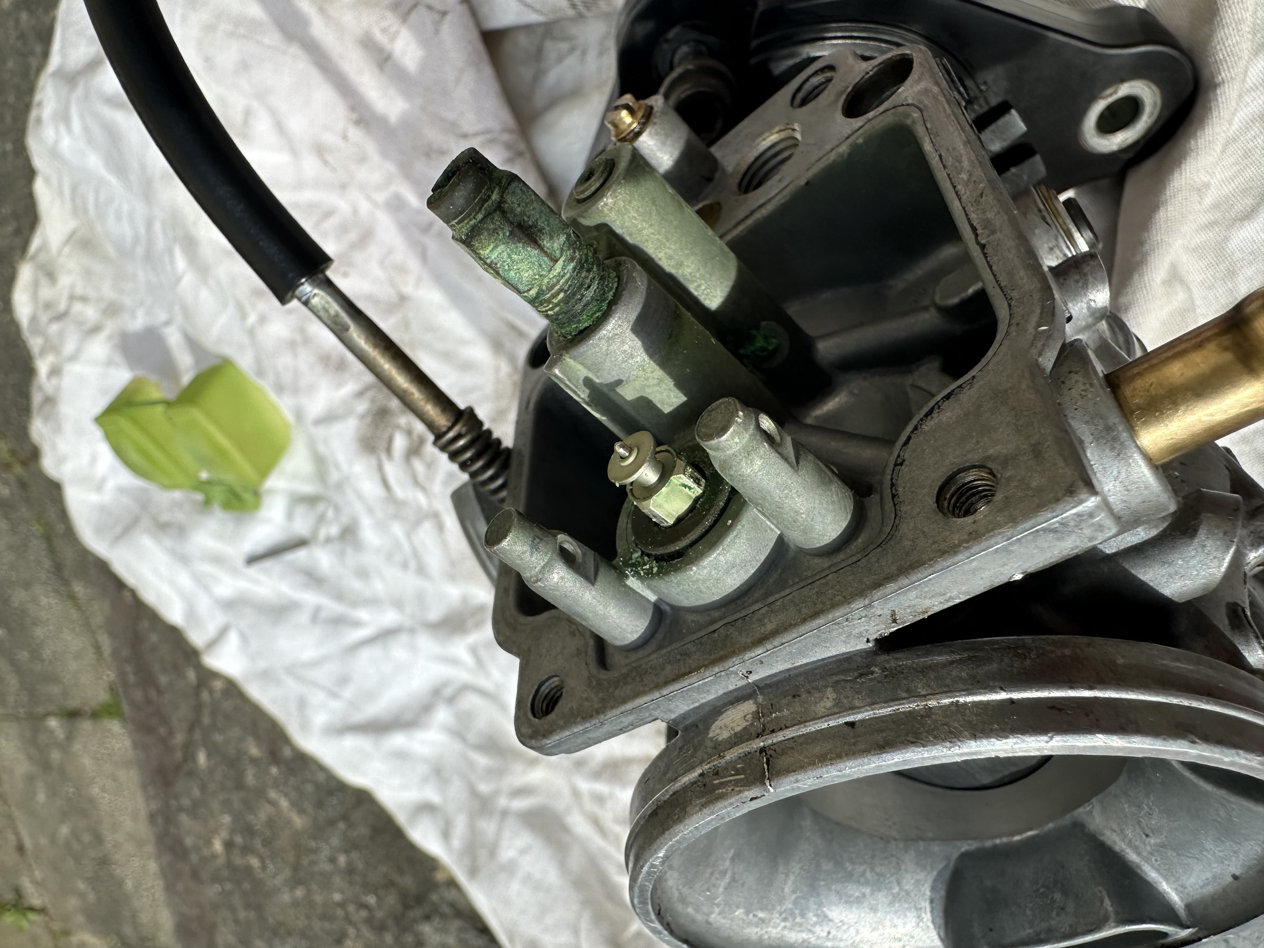 Noch schlimmer wars im Vergaser - alles grün. Dachte schon an Algen, aber das scheint am Sprit zu liegen. Das Schwimmerventil war total verklebt und hat gar kein Benzin mehr vom Tank angenommen. Dicht!