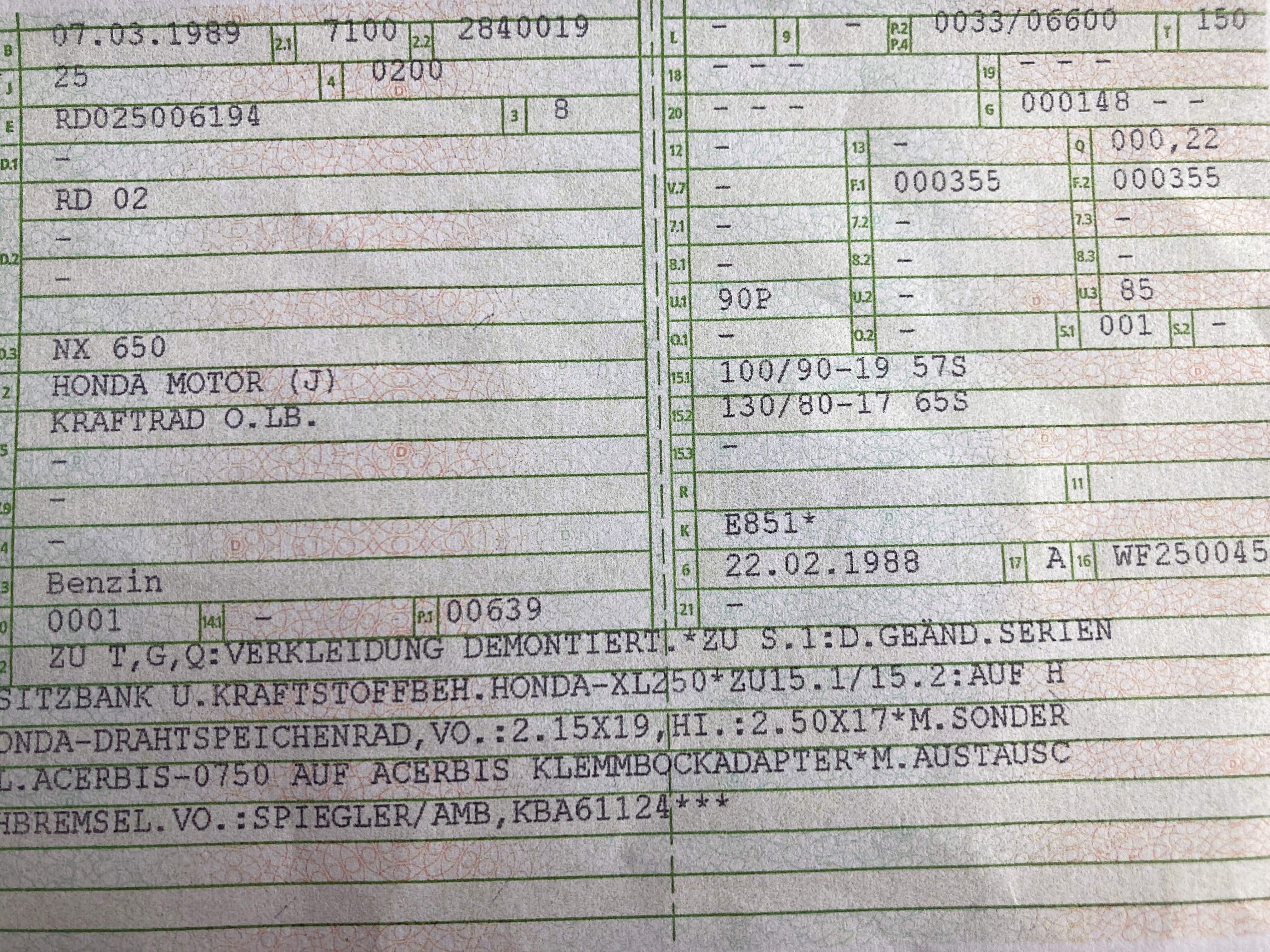 1. Kein Gutachten für die Reifen. (Pirelli 90/90-21/ hab da ein Gutachten für die RD08 gefunden was er aber nicht sehen wollte)