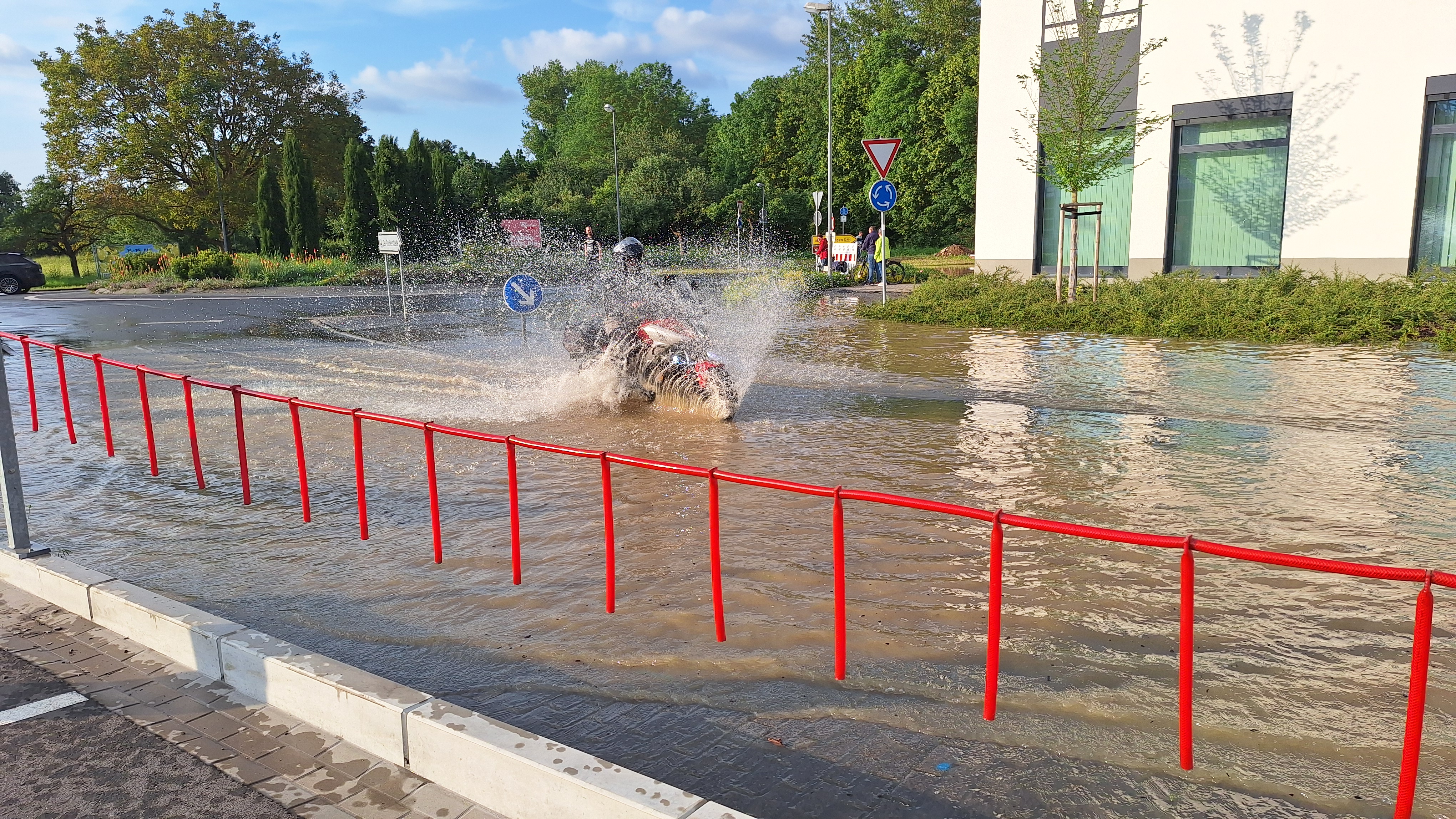 Wir haben auf dem Rückweg in Lauda übernachtet. Die Tauber ist über die Ufer getreten und hat die Straße unter Wasser gesetzt. Ralf hatte Spaß