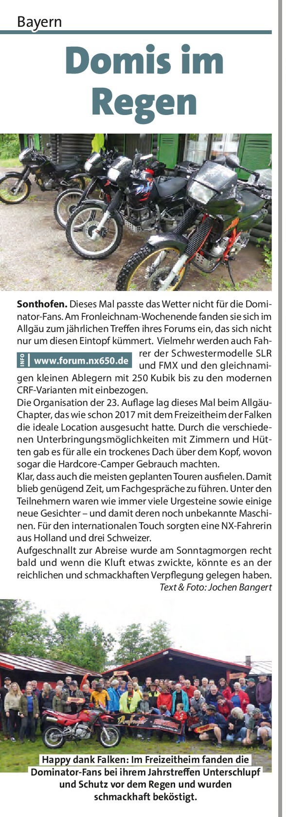 Heute erscheinen die verschiedenen Regionalausgaben der Motorradszene; natürlich auch die MSB für Bayern. Und jetzt darf Hörbiee mal wieder Louis in Kempten "plündern", da der Bericht übers Domi-Treffen mit drin ist. Gruß Jochen
