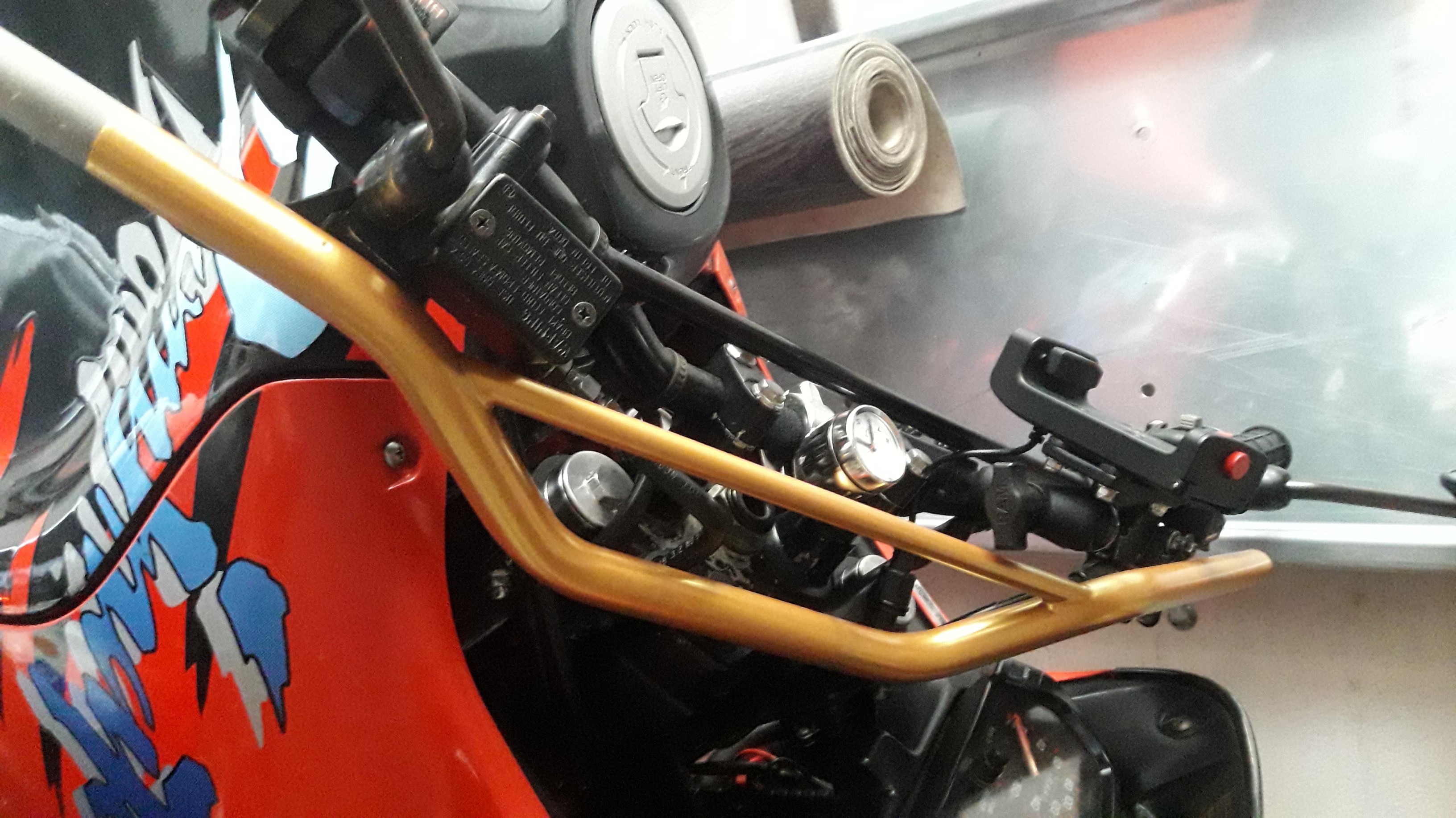 Der LSL gefällt mir gut, vor allem weil der keine Querstrebe hat. Ich will nämlich auch den Koso Tacho dort hinbauen, und da stört so eine Strebe natürlich. Hier nochmal zwei Bilder von meinem aktuellen Lenker (Bitte meinen Aluprofil-Prototypen ignorieren :mrgreen: )