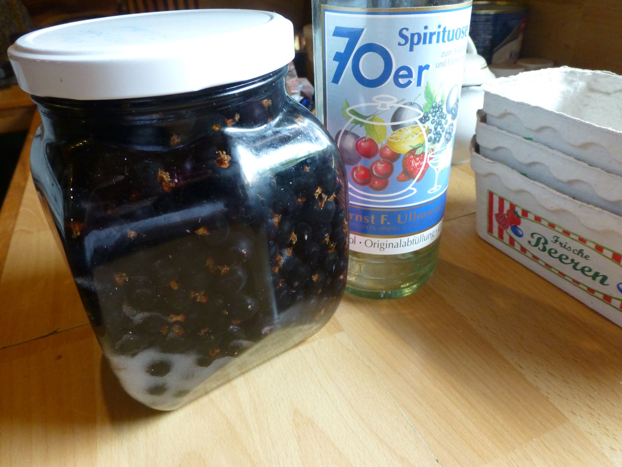 Es sind am Ende 965 g schwarze Johannisbeeren geworden, dazu 150 g Zucker und dann das Glas mit klarer Flüssigkeit aufgefüllt. Es ging aber nur etwas mehr als eine halbe Flasche rein. Da muß ich nochmal nachfüllen, wenn sich der Zucker aufgelöst hat.