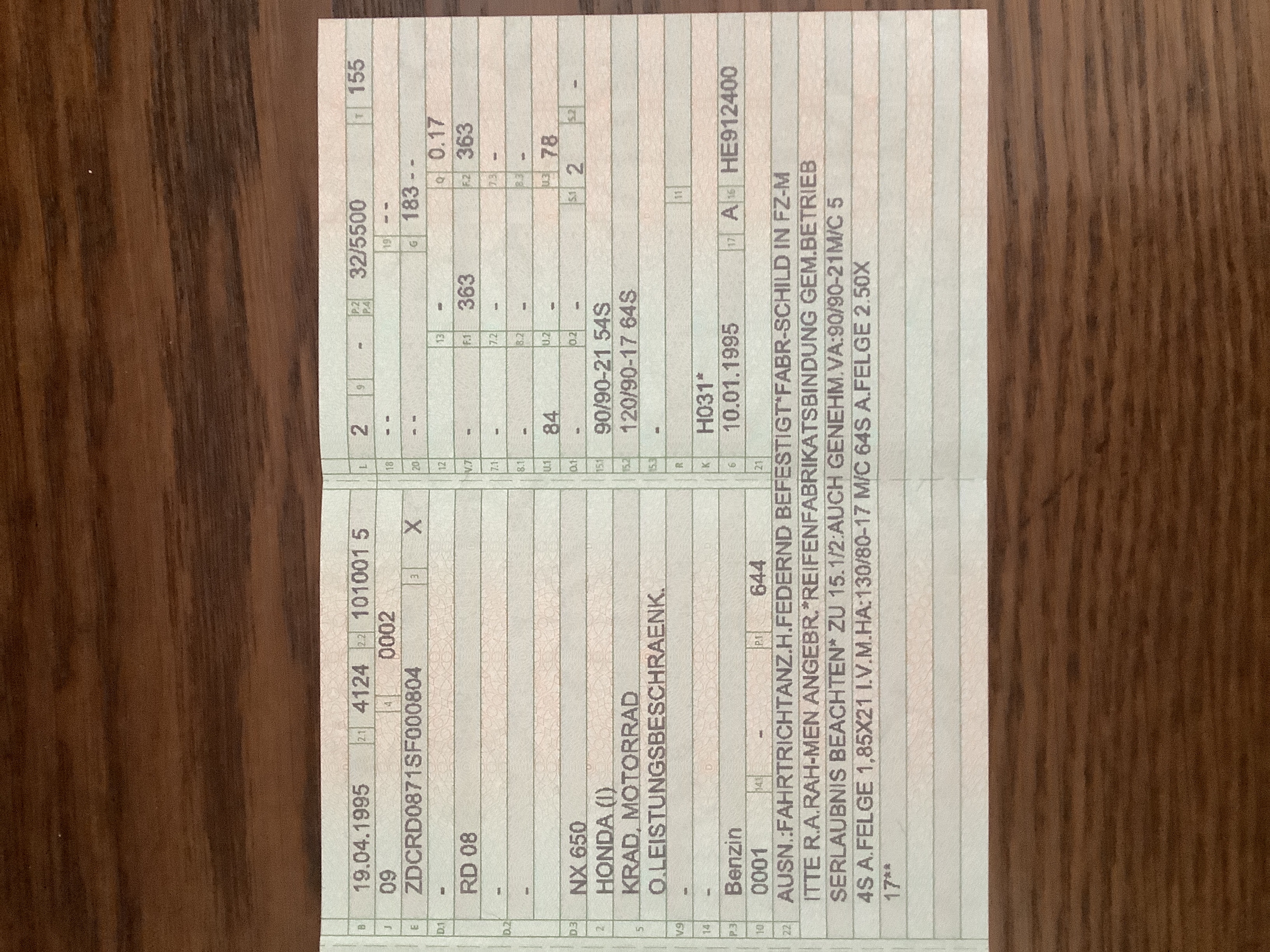 Als ich im Dezember meinen 130er habe eintragen lassen, wollte ich auch die Reifenbindung ausgetragen bekommen. Bei mir sieht der Schein jetzt so aus: Ich würde das mal so deuten, daß eine eventuell für meine Domi vorhandene Betriebserlaubnis an der Stelle nicht mehr zu beachten ist.