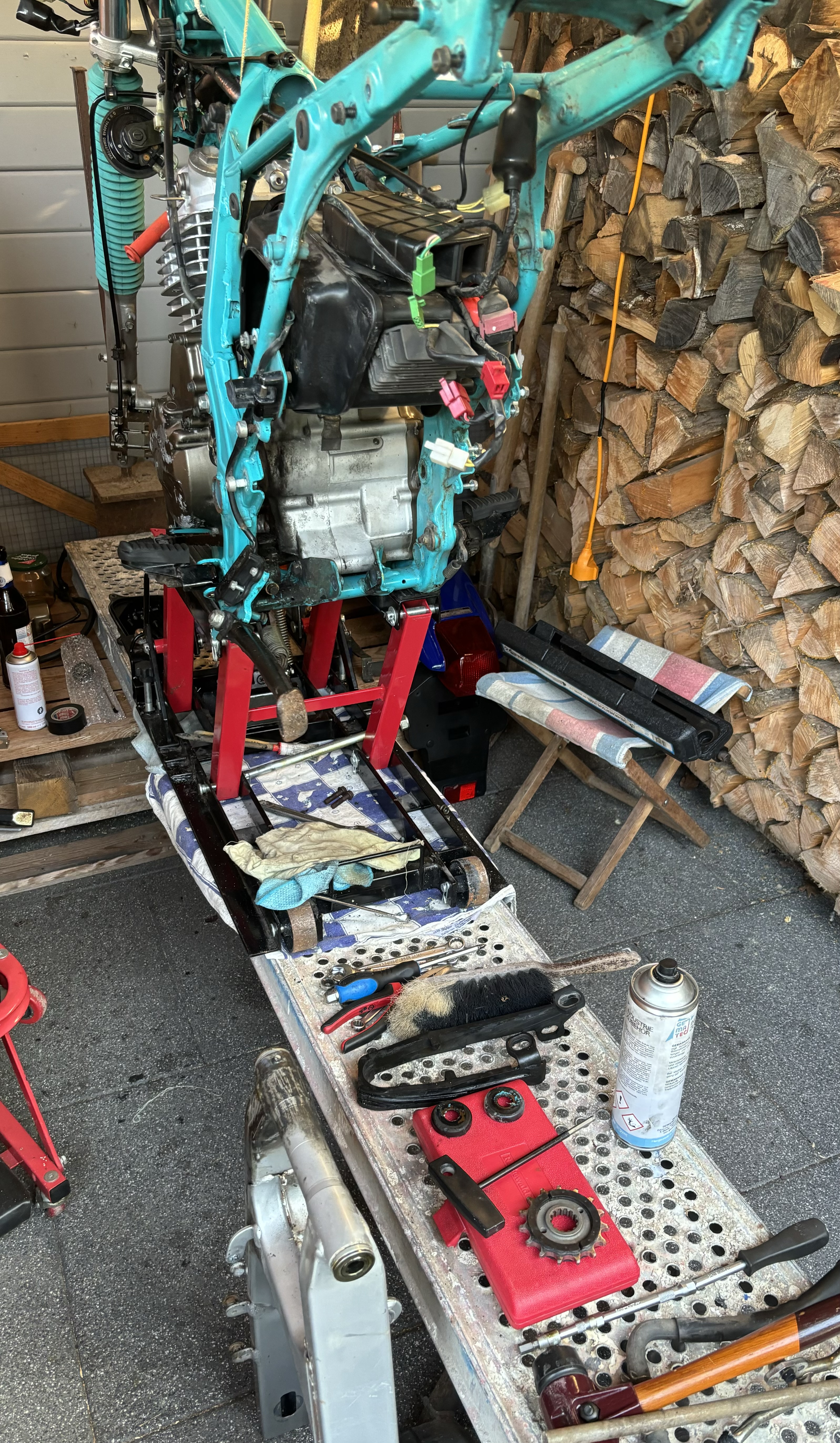 - einfach mit dem Schlagschrauber die Muttern der beiden hinteren Motor-Halteschrauben lockern und die Schwinge fällt heraus