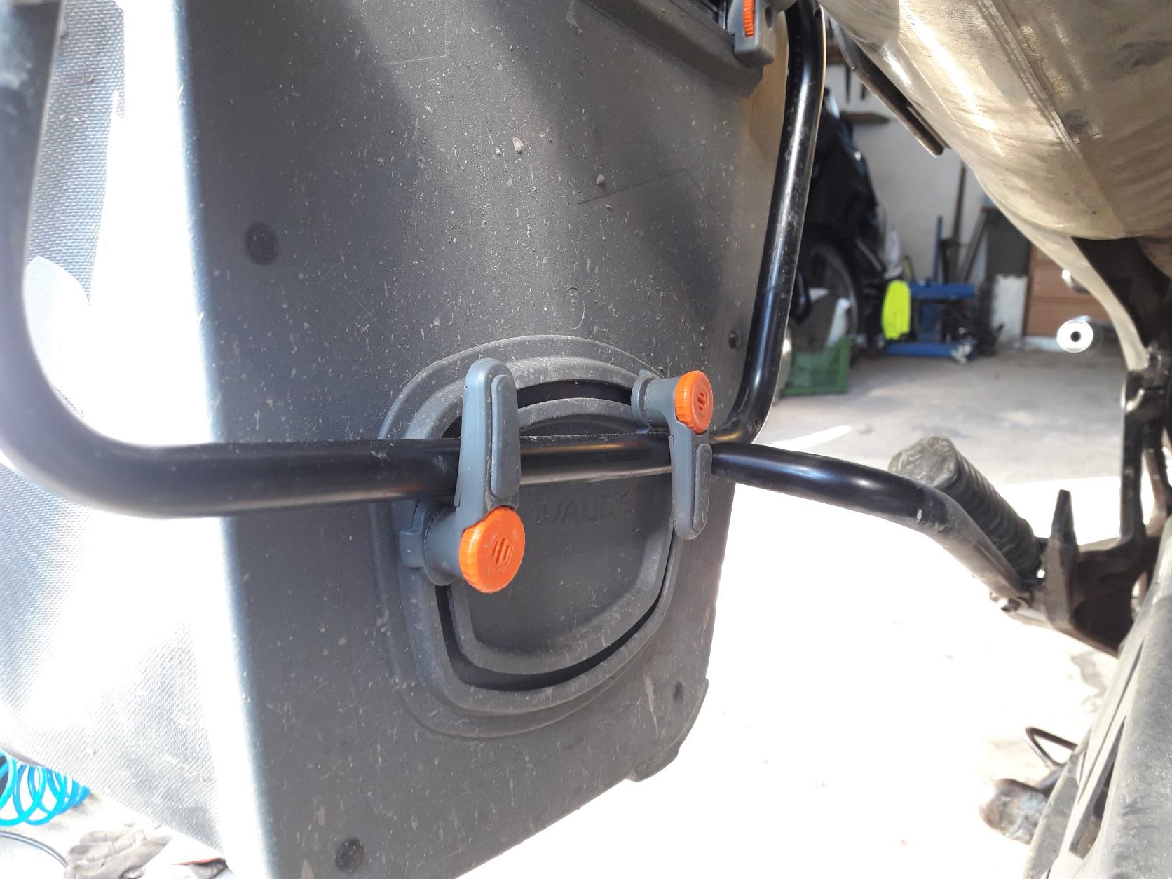 Hier mal wie das mit zwei Haltern aussieht. Den unteren Halter löst man mit dem orangenen Rädchen, dreht das Teil rum, und dann die Tasche nach oben weg. Hält bombig, auch off road.