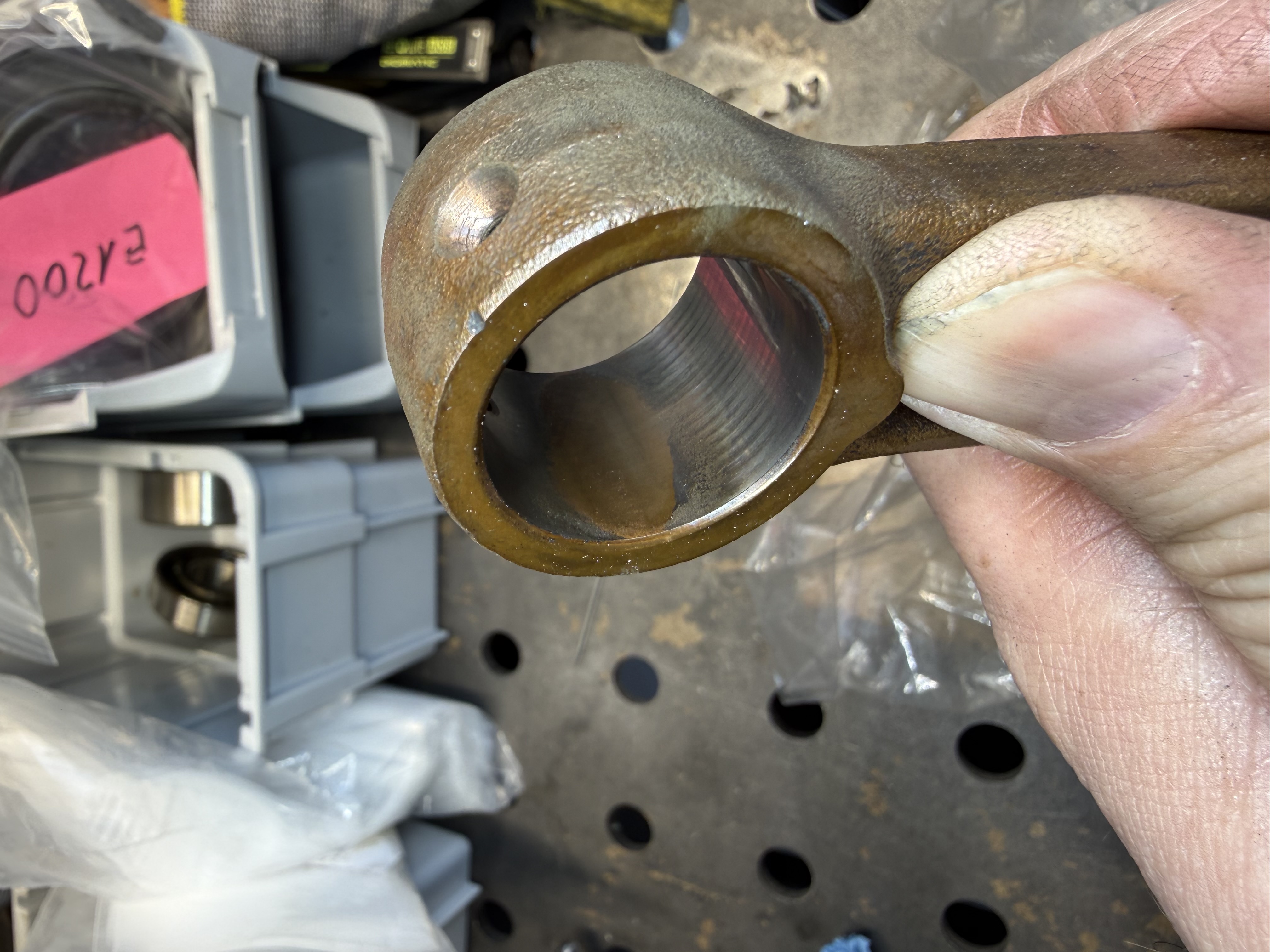 Hab heut mal Kurbelwelle sauber gemacht, angeschaut. Ist das normal im Pleul, sieht aus als wäre die Beschichtung weg, Riefen sind keine, alles glatt.