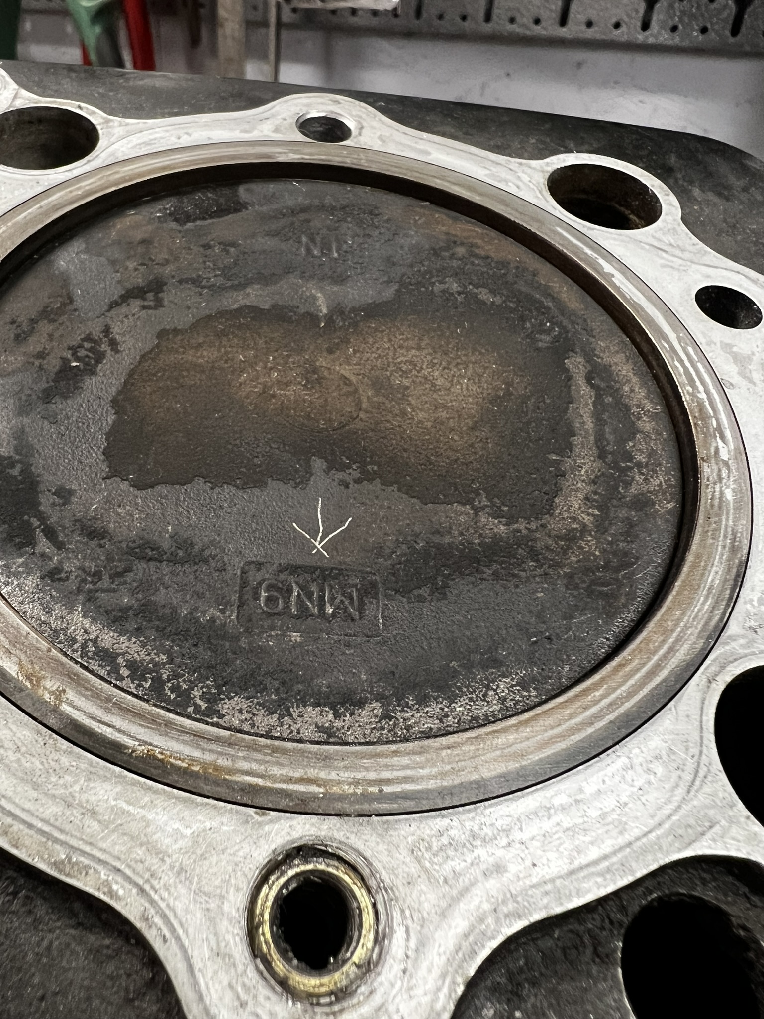 Ich habe nun angefangen, den Motor zu zerlegen. Dabei ist mir der auf der Einlassseite defekte Kolben (Klemmspuren) sowie die nicht passende Markierung aufgefallen.