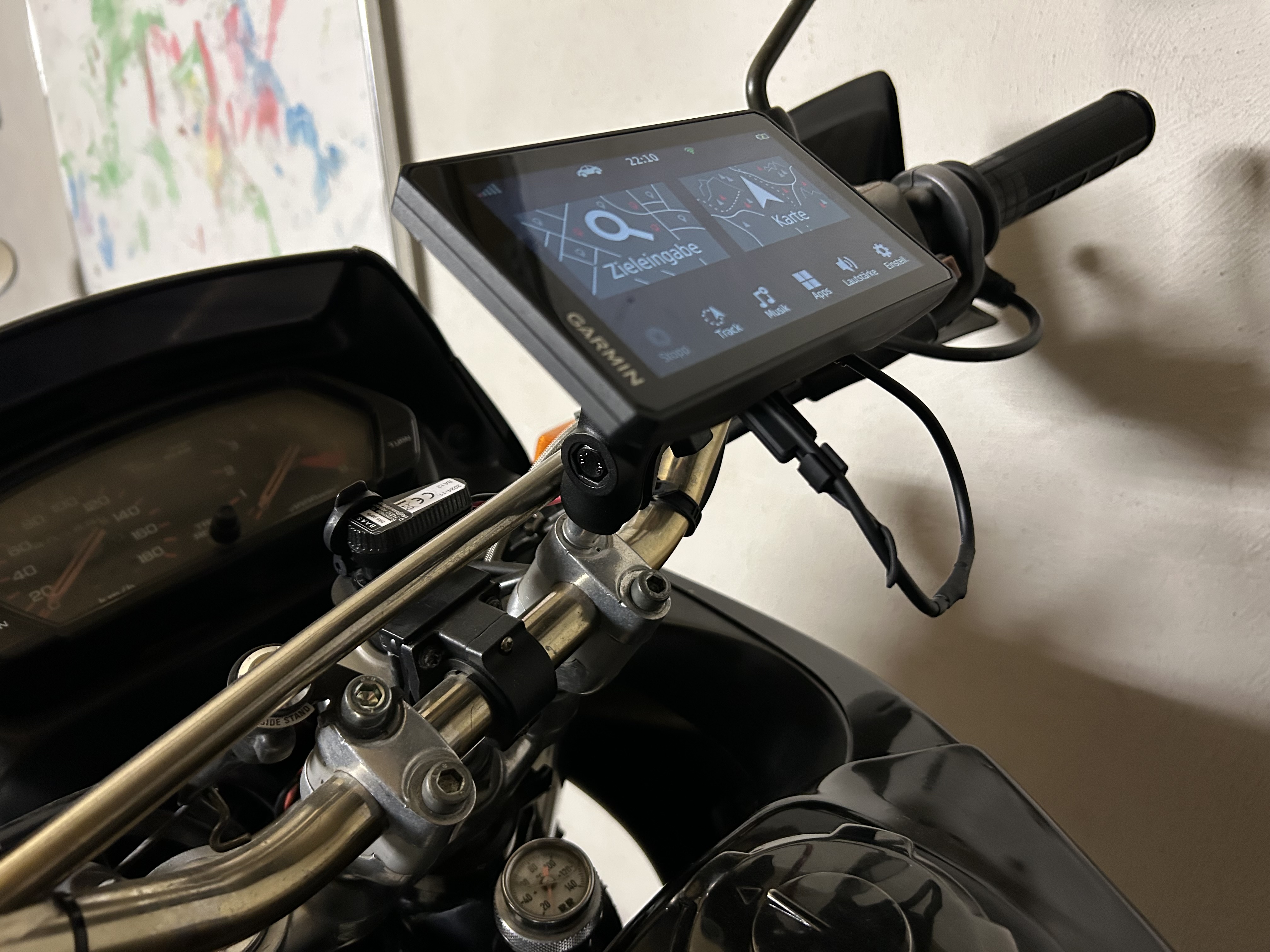 Und für die VTR... noch keine Ahnung. Für die habe ich noch nicht einmal eine Steckdose. Wahrscheinlich nutze ich bei der nur die RAM-Mount Halterung ohne Kabel und den internen Akku des Navis. Fürs Zwischendurch Aufladen liegt im Tankrucksack das passende USB-Kabel und eine Powerbank. Das hat letzten Sommer für eine Wochenendtour auch beim TomTom so funktioniert.