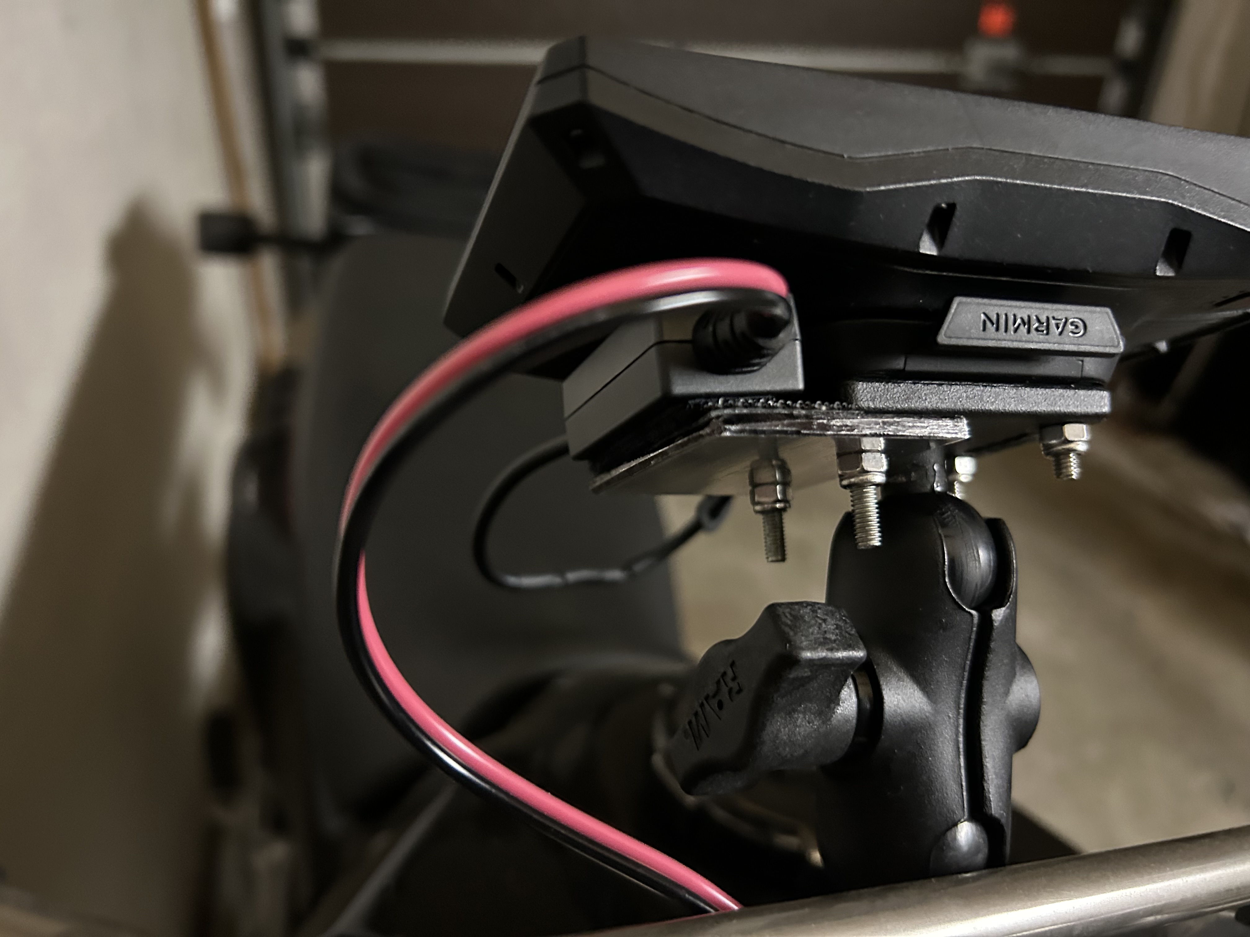 Am Kästchen des Kabel ist ein verklebtes Klettteil, dessen flauschige Gegenseite irgendwo in der Nähe des Instrumentenpanels verklebt. Überschüssiges Kabel wird mit Klettstraps befestigt, zum Beispiel um den Ram-Mount-Arm gewickelt..