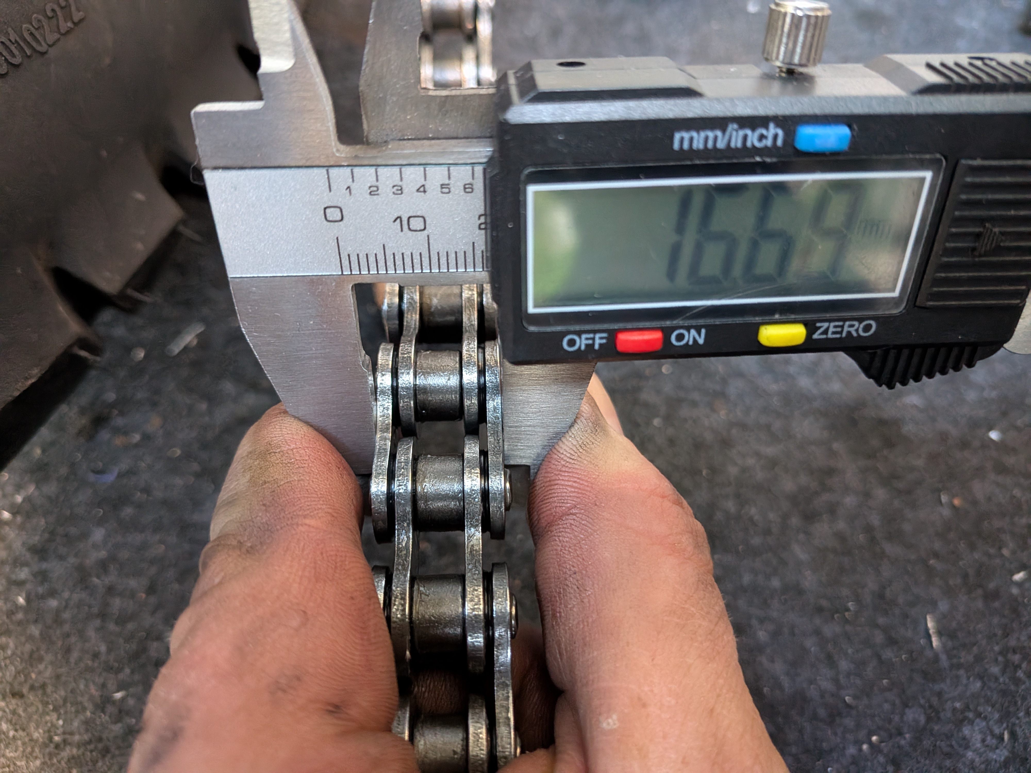 Die anderen Kettenglieder hatten Außenmaße von rund 16,7mm. Daran habe ich mich beim aufpressen der Lasche orientiert. Das Werkzeug bietet keine Möglichkeit per "Verfahrweg" zu arbeiten. Heißt alle 1/4 Umdrehung oder so wieder Werkzeug runter und messen. Wenn die Lasche dann drauf ist müssen einzeln die Nietköpfe erzeugt werden.