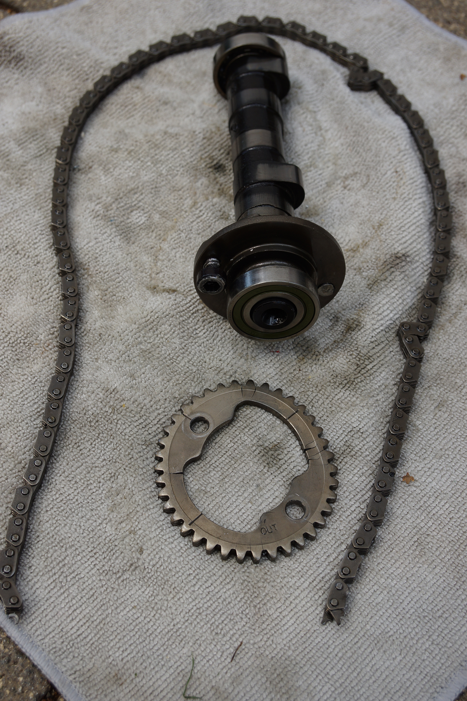 Somit habe ich den Verdacht, dass sich am Kettenrad eine Schraube gelockert hatte, deren Kopf an der Lagerschale der Nockenwelle geschliffen hat und schließlich abgerissen wurde und durch die Unwucht die Antriebskette gerissen ist und das Kettennrad verbogen wurde.