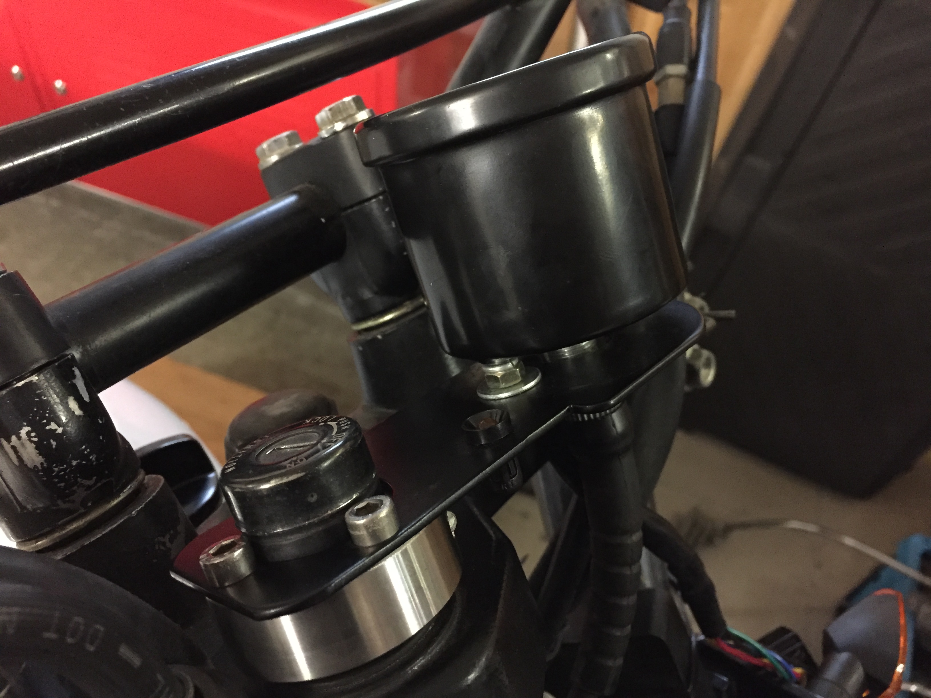 Die Halterung ist ein wenig höher gelegt, momentan mit einer Gewindestange, dass die Tank Sitzbanklinie passt, ohne das Heck zu ändern.