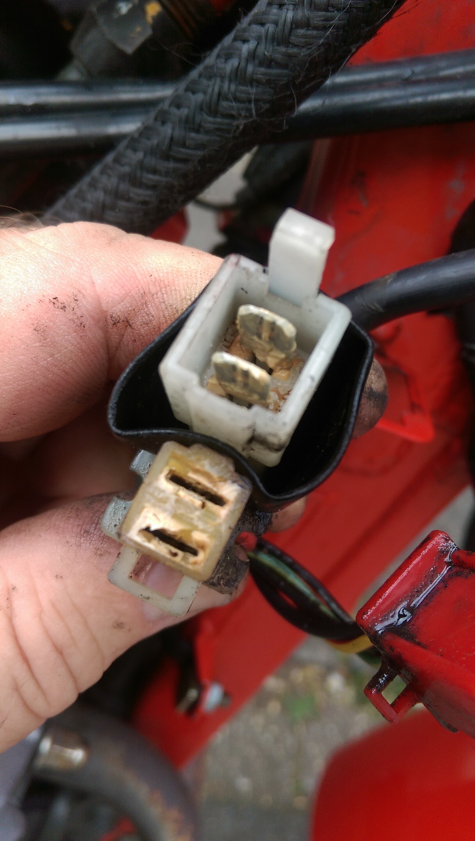 So haben die bei meiner Domi auch ausgesehen. Hab etwas sauber gemacht und Kontaktspray rein. Hab das auf der linken Seite mit den Steckern auch gemacht. Da gibts einmal grün, schwarz, und nen 2-poligen Stecker. Und den gelben kleinen der zur Spule geht auch noch.