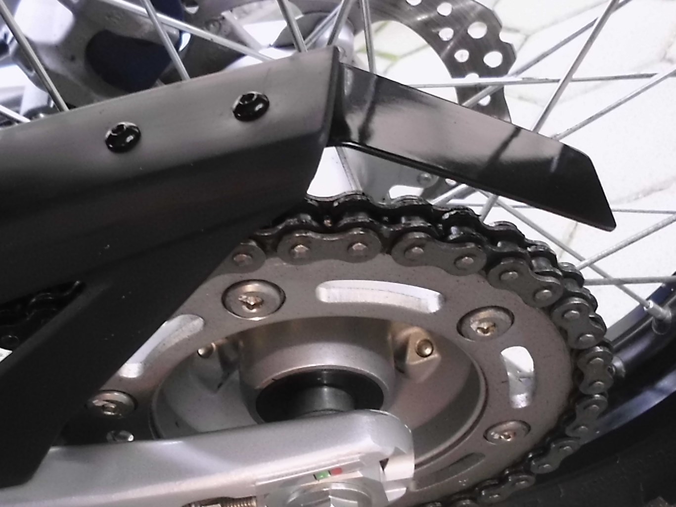 Ja, die Kettenschutzverlängerung habe ich aus einer fertigen Aluleiste (35mm Breite) selbst angefertigt. Gibt es in jeden Baumarkt bei den Aluprofilen in 1 Meter Längen!! Die Gesamtlänge beträgt 160mm. Bedeutet 80mm sitzt unter dem Kettenschutzkasten mit zwei M5er Rundkopf-Edelstahlschrauben + selbstsichernden Muttern und 80mm als abgewinkelte Verlängerung über der Kette/Kettenrad. Den Winkel habe ich im Schraubstock gebogen. Passt, hält sehr gut und vibriert überhaupt nicht !!! Nutzen 100% weniger Kettenöl an den Felgen, der Verkleidung etc.