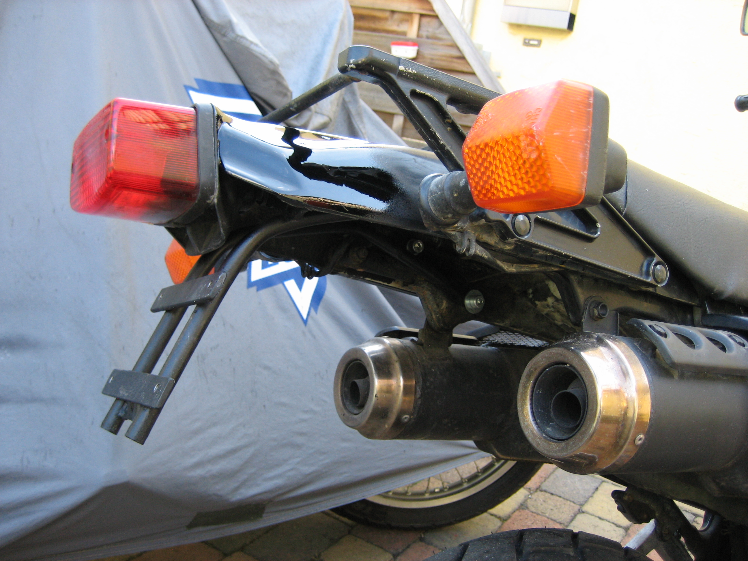 So, das Endergebnis meiner GFK-Reparatur-Künste liegt in Form einer vom Profi neu lackierten Verkleidung vor. Siehe Bild. Die hellen Streifen sind Lichtreflexe. Ich glaube, es käme niemand auf die Idee, dass es sich um eine reparierte Stelle handeln könnte. Ich habe mir Ersatz-Verkleidungsteile beschafft, weil ich es satt hatte, mit halbierten Schriftzügen an der Seite unterwegs zu sein. Dem Acerbis-Tank fehlen ja, die Buchstaben "ator" links, bzw. "Domin" rechts...