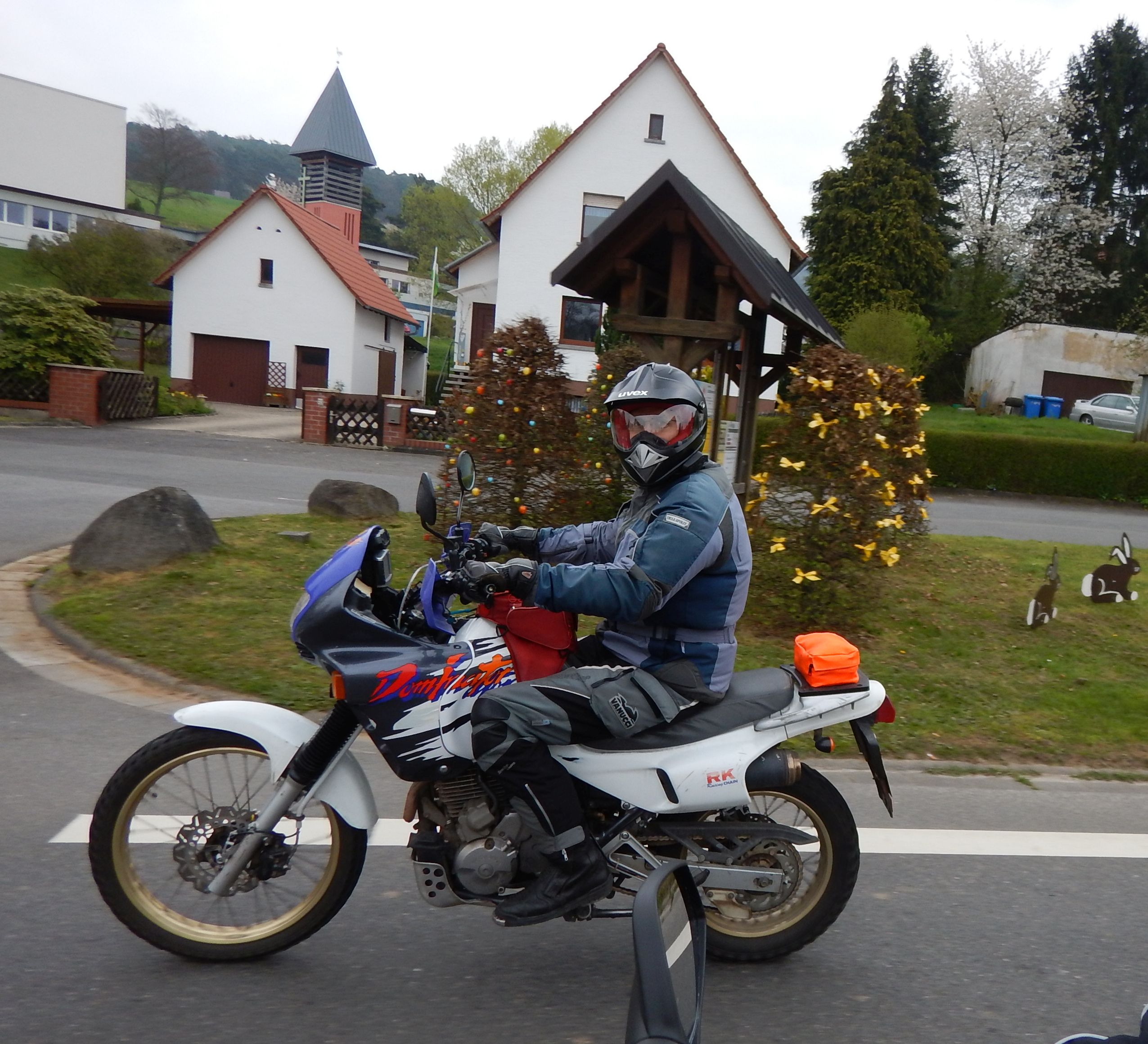 Auf Charly's Fahrbildern ist ein mir unbekannter Mensch mit einer weiß-grau-blauen Domi mit RK-Aufkleber und Wave-Bremsscheibe...