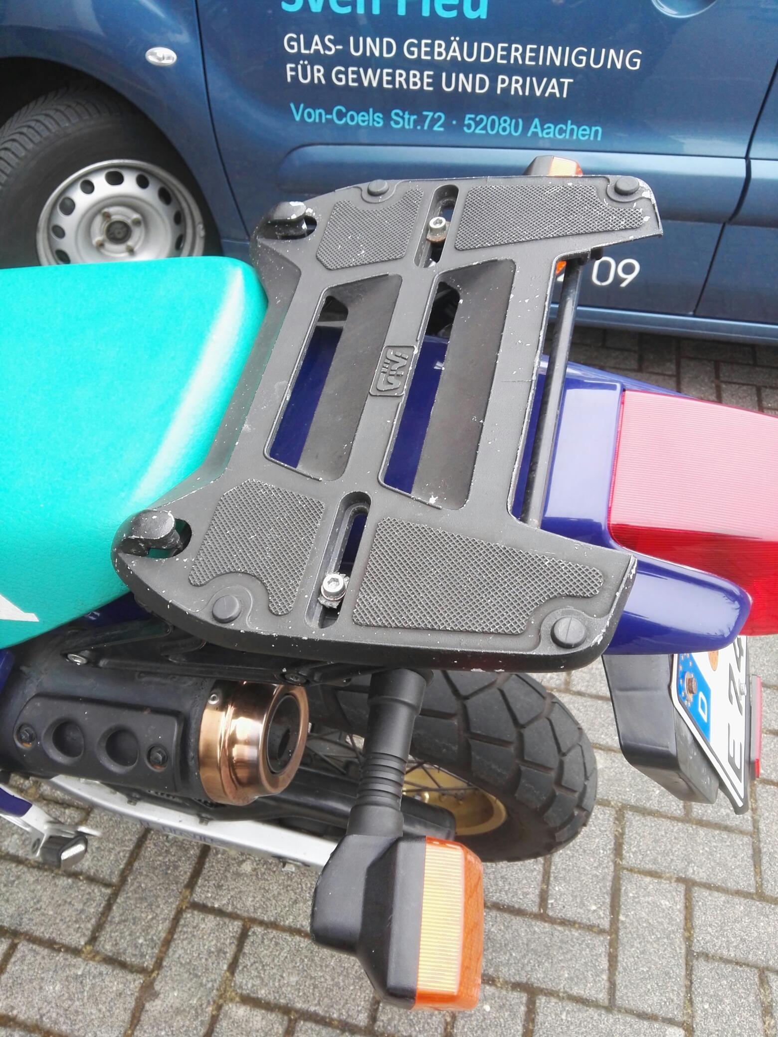 Der Gepäckträger auf meiner Domi ist von Givi. Allerdings habe ich so einen Givi Träger noch nie gesehen und ich kann mir nicht recht vorstellen, wie da ein Topcase drauf soll, weil die Givi Träger die ich kenne und auch schon hatte sehen anders aus. Muss hier vielleicht noch eine Adapterplatte drauf?