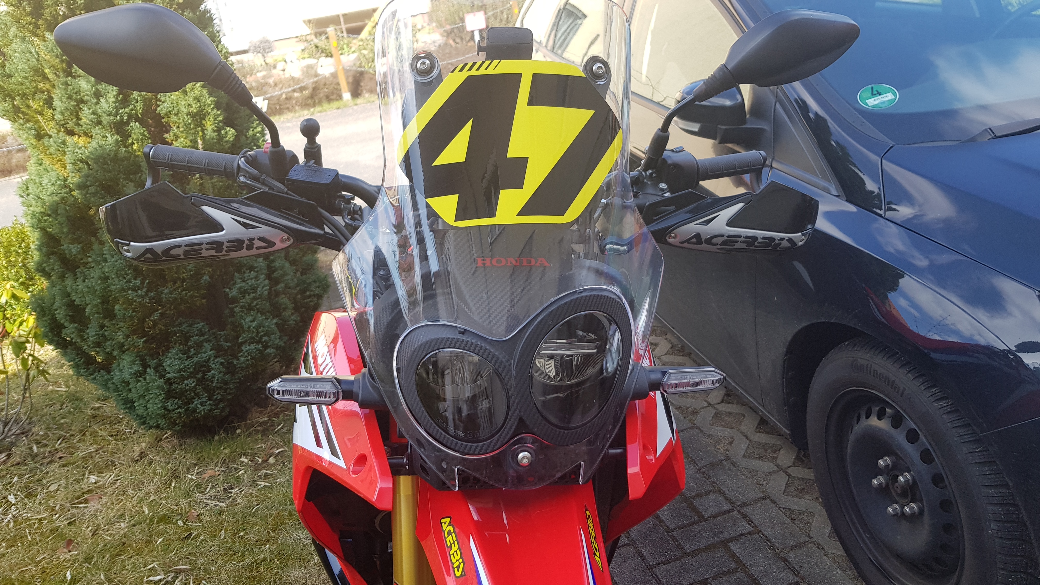 ich habe die Acerbis Multiplo an meiner 2017'er Rally und die passen dort ohne Probleme. Stossen auch nicht an die Scheibe, oder so.