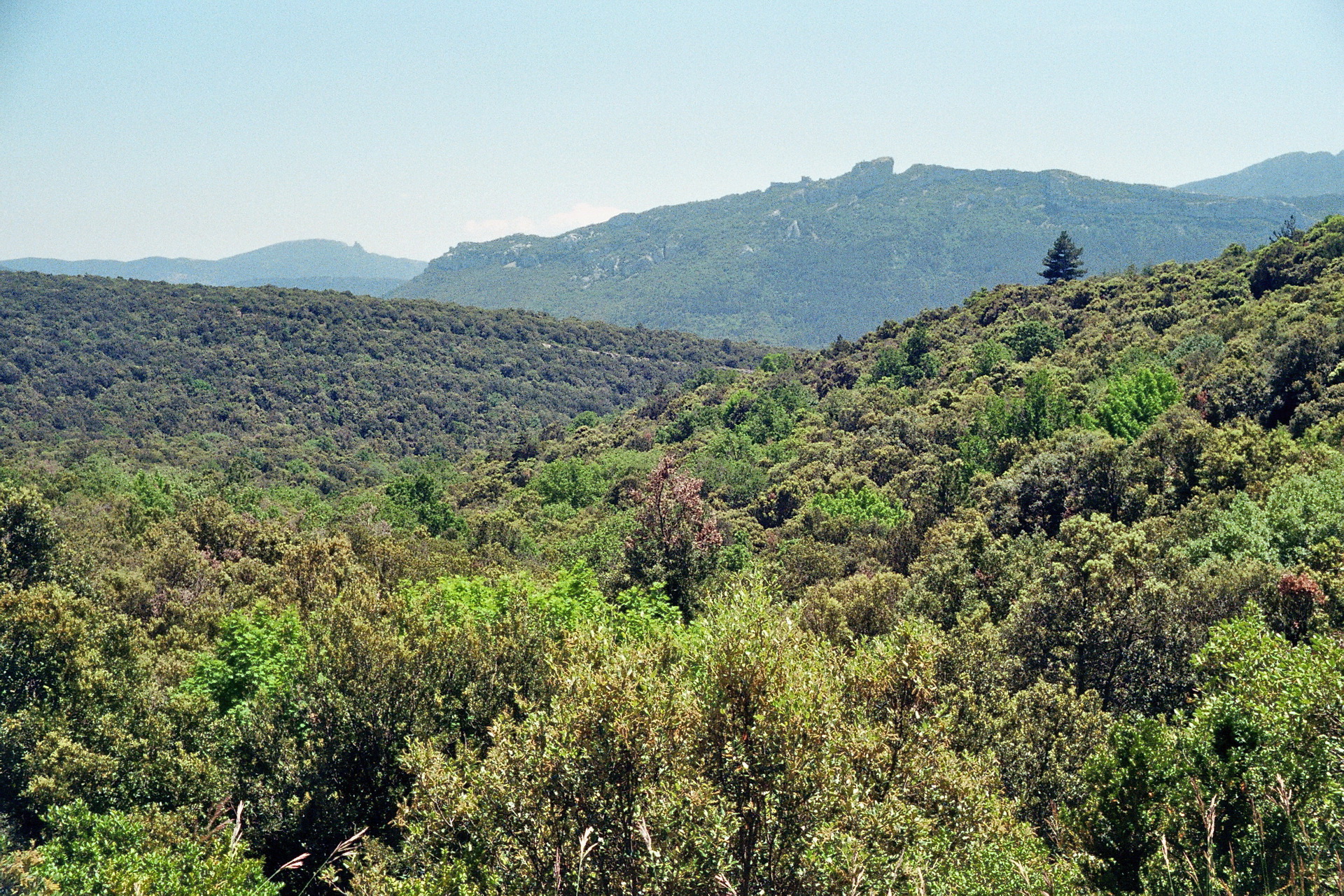 7. Juni: Ich genieße mein Frühstück bei heiterem, warmem Wetter. Der Spiritus, mit dem ich meinen Benzinkocher vorheize, ist ausgegangen. Ich lasse mir von der Platzwirtin etwas „White Spirit“ geben, um dann festzustellen, dass es Terpentin ist. „Alcool à brûler“ hätte ich gebraucht! Na ja, mit meinem Reinigungsbenzin klappt es auch, rußt halt ein bisschen! Heute geht es zum Thyminanpflücken in die rund 80 km entfernten Montagne d’Alaric. Dazu muss ich die Pampa und einige Mittelgebirgsrücken überqueren. Unten: Blick auf Prades und den Mont Canigou