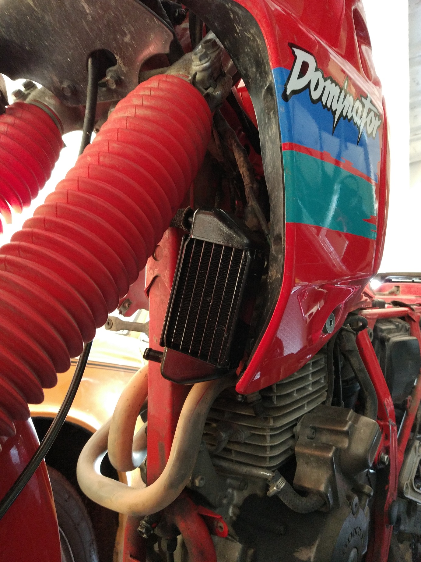 Der Kühler stammt von einer BMW R850, die hat davon je Seite einen. Mein Plan ist ihn an der Hupenhalterung zu montieren. Er hat auf den ersten Blick perfekt gepasst, aber beim Lenken stößt leider die Gabel knapp gegen ihn, so dass es noch 2-3mm zum Endanschlag sind. Weiter nach hinten kann ich nicht, da der obere Schlauch schon eng am Rahmenrohr vorbeigeführt wird und ich ihn nicht abquetschen möchte.