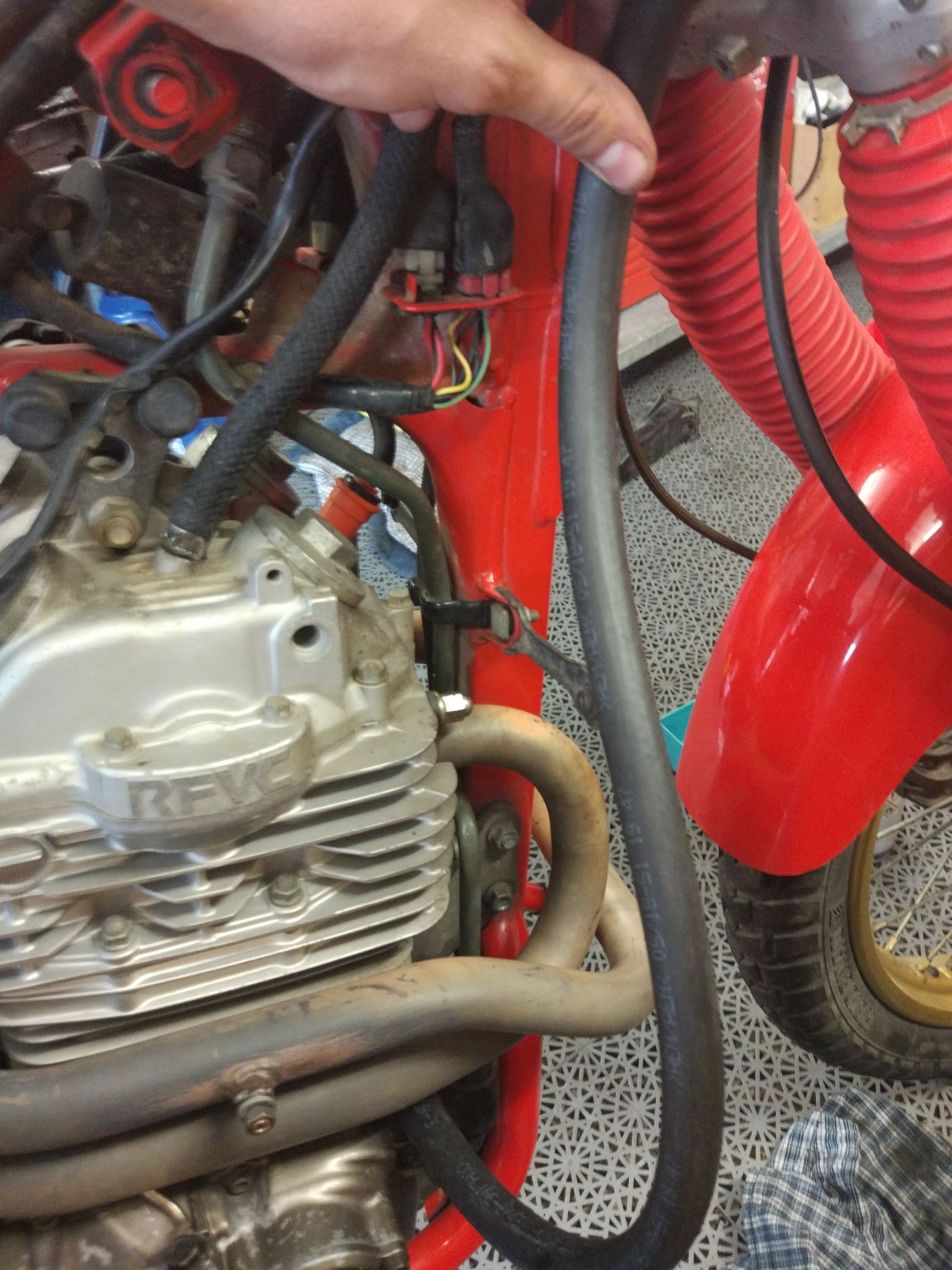 b) Steigleitung vom Motor kommend -> Kühler unten -> Kühler oben -> Steigleitung Richtung Rahmen