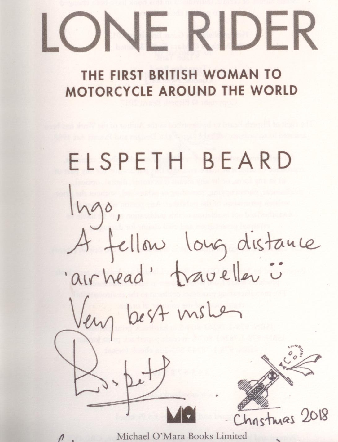 Zugegeben, es handelt sich nicht um eine Weltumrundung mit einer Domi sondern mit einer Gummikuh, die eine 23jährige Britin zwischen 1982 und 1984 als Alleinreisende unternahm. Route: GB-USA-Australien-Südostasien-GB. Sie hat es nie an die große Glocke gehängt - bis dann eben plötzlich Leute wegen der Filmrechte bei ihr anklopften. Da hat sie aber erstmal ein Buch geschrieben, das 2017 rauskam. Sehr vergnüglich zu lesen - allerdings auf Englisch. Schulenglisch reicht völlig aus. Auf die Widmung bin ich natürlich stolz.