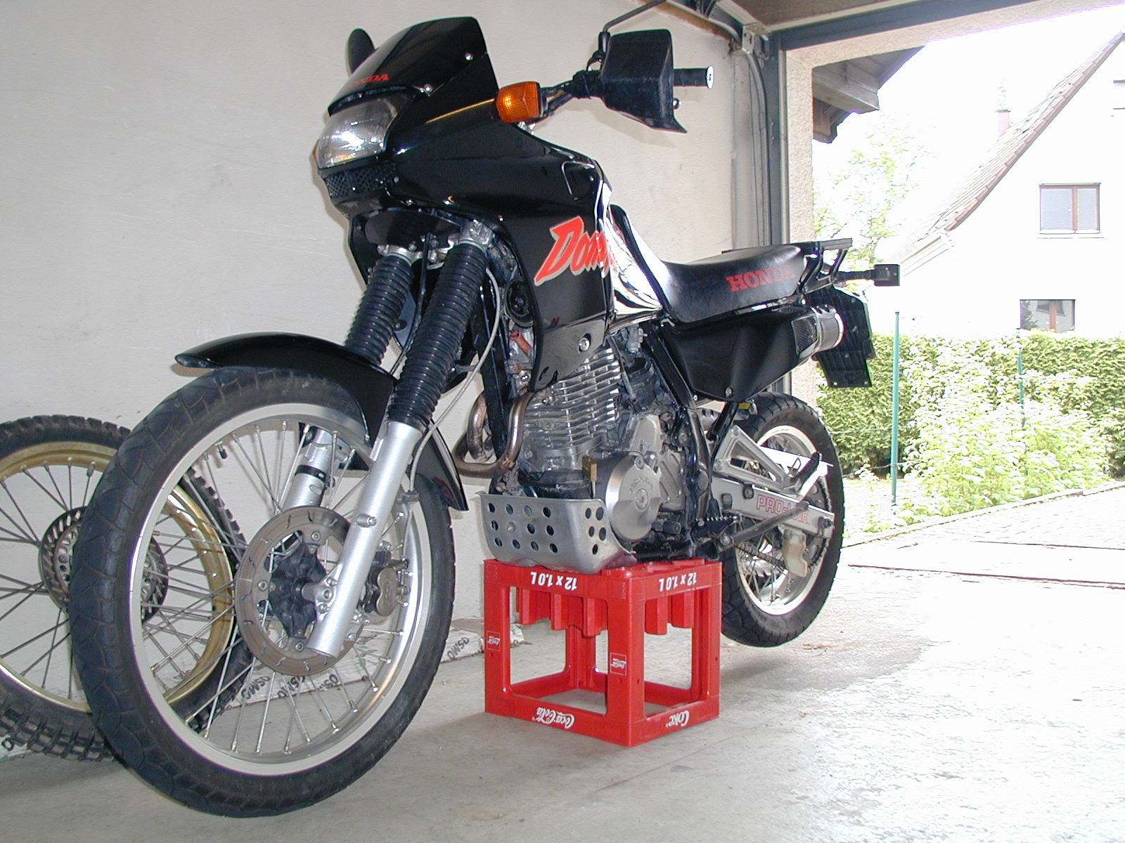 Wenn du bei beiden Holmen gleichzeitig wechselst, dann die Domi am Motor unterbauen, sonst sackt sie vorn ein und kippt vom Hauptständer, wenn du einen hast.