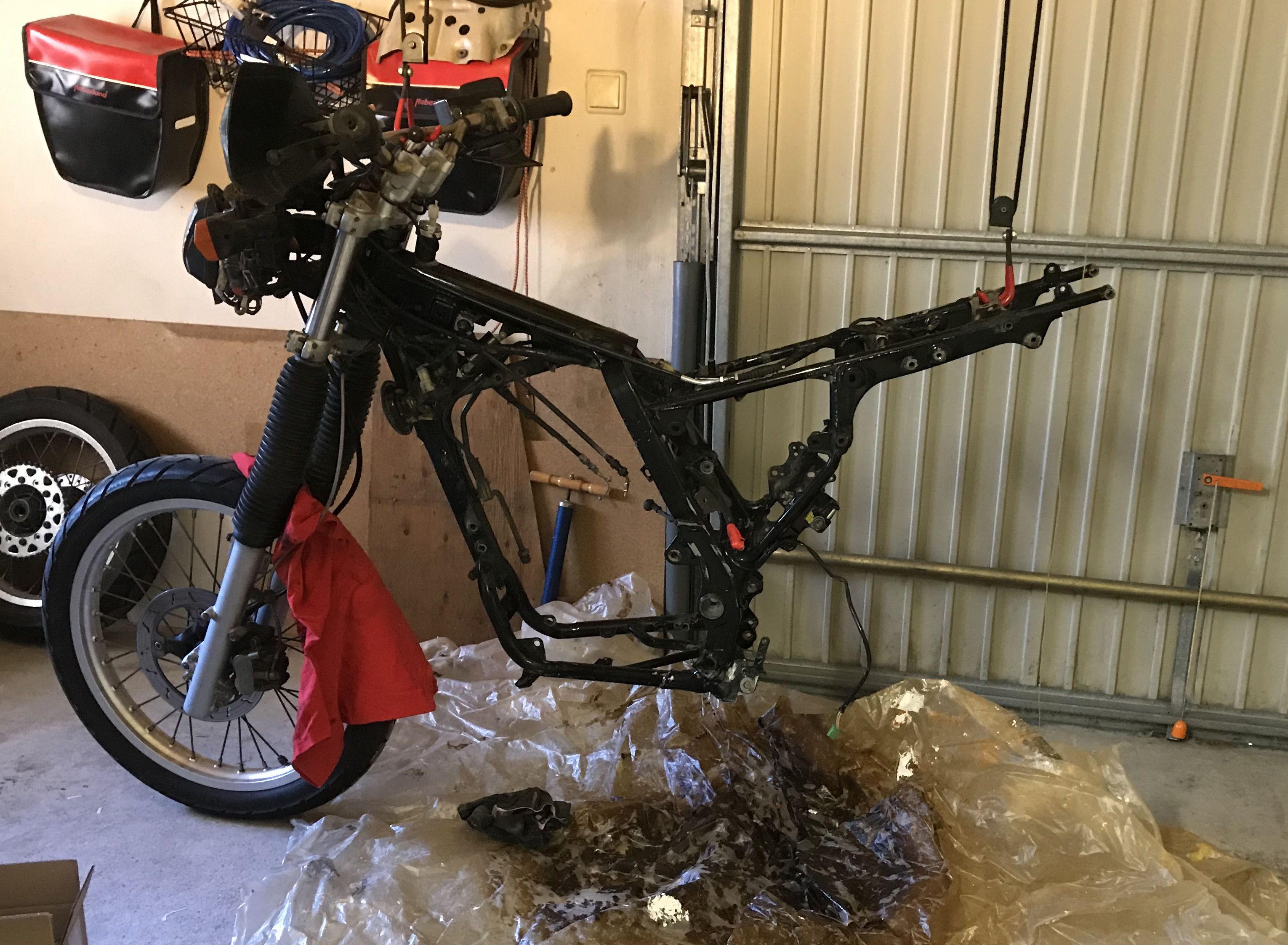 Stichwort Rost: Die rostigsten Stellen waren die um die Fußrasten bzw. Seitenständer. An allen anderen Stellen waren es eher nur kleine Bereiche. Und der Rost war zum Glück überall nur oberflächlich. Ich hatte keine Mühe, den Rost runterzuschleifen. Also alles in allem ist der Rahmen von der Substanz her noch in Ordnung. Aber der schwarze Lack scheint sehr dünn von Honda aufgetragen worden zu sein. So kommt es mir zumindest vor. Die Grundierung hingegen ist robust.