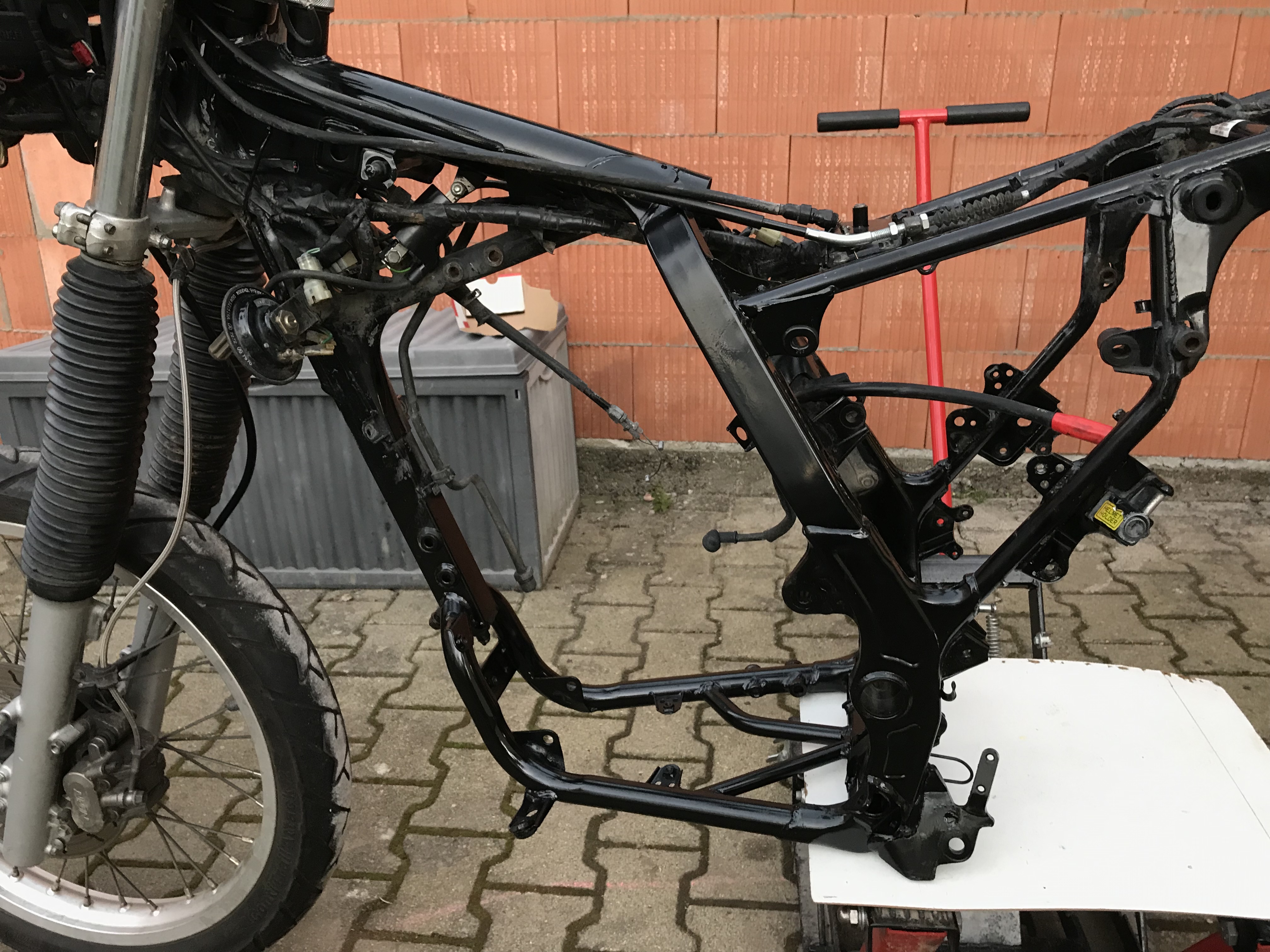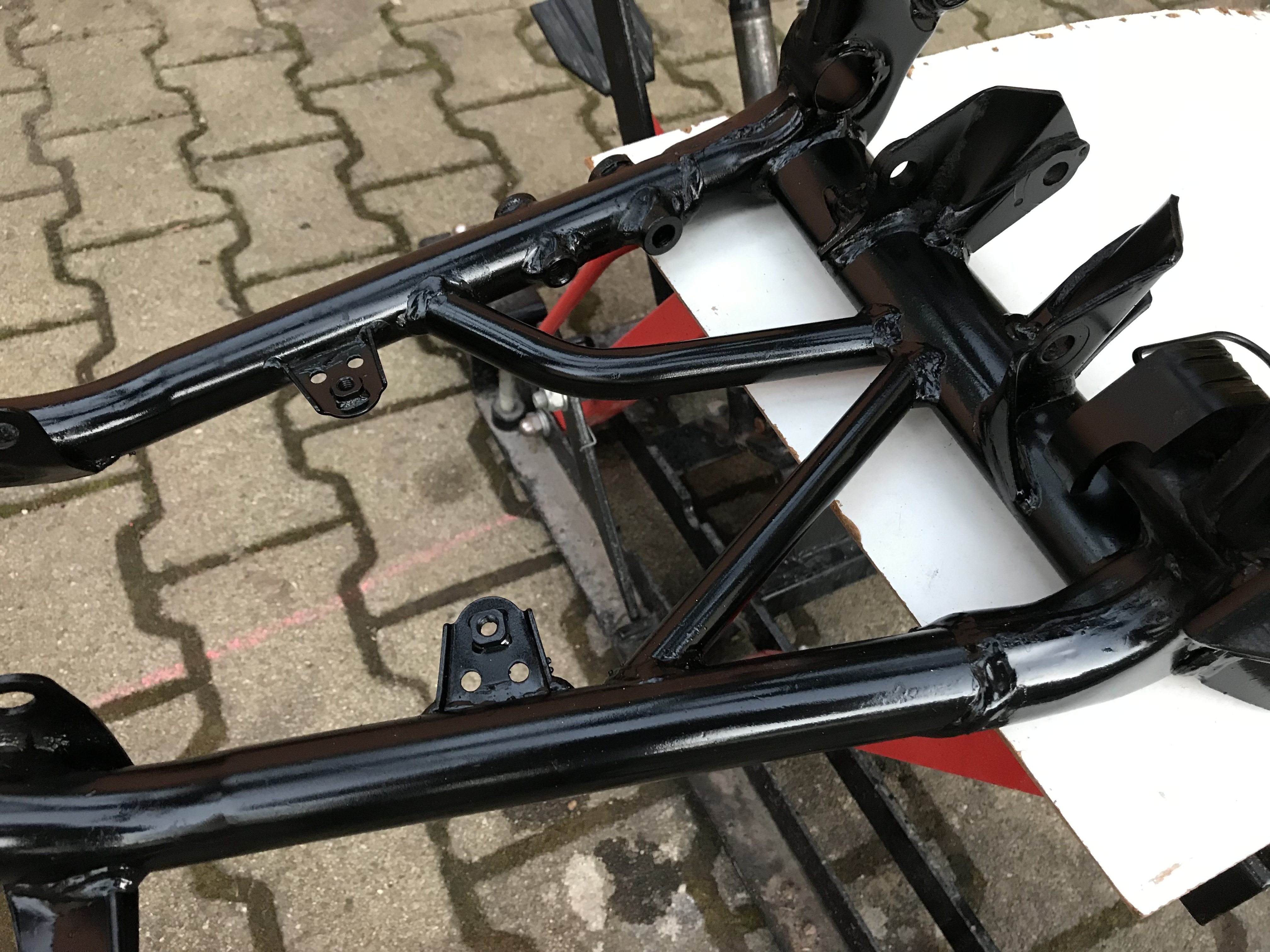Ich entschied mich zu einer Teillackierung. Der untere Rahmenteil, insbesondere der Bereich wo der Motor drin sitzt und der Bereich der Fußrasten wurde komplett mit der Spraydose lackiert. Am oberen Teil, wo nur an kleinen Stellen der Lack abgeschabt wurde, habe ich mit dem Lackstift korrigiert. Die Stellen sieht man später sowieso nicht, wenn die Verkleidung wieder dran ist.