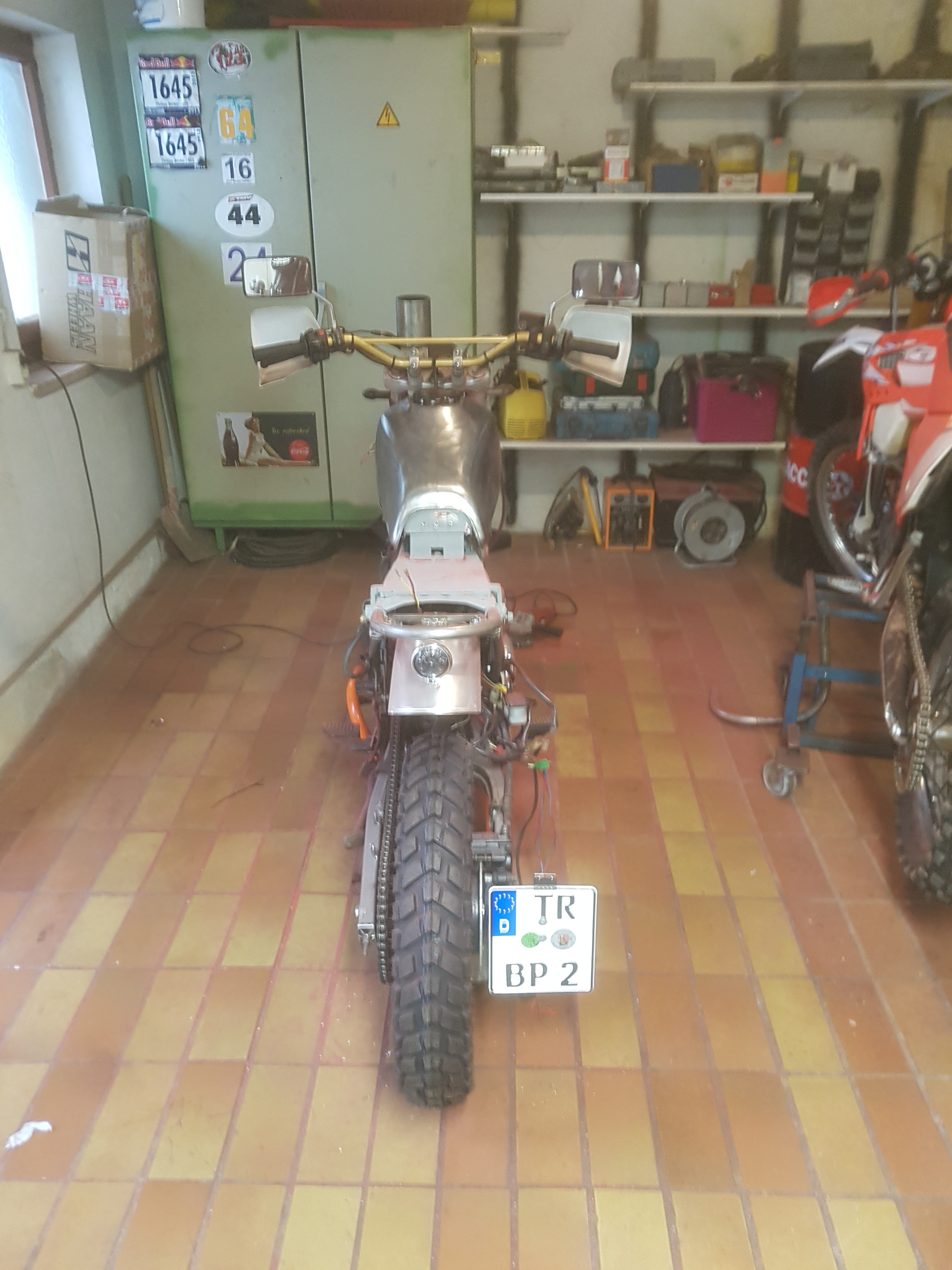 So, nach zwei Wochen Pause und Enduro Rennen in Tschechien konnte ich schonmal ein wenig weiterarbeiten. Rahmenloop der 100 % ig past angepasst und Heck entsprechend gekürzt. Teile des abgeschnittenen Hecks konnte ich somit an den unteren Loop schweissen. Der Loop selber ist steckbar gestaltet mit eingeschweisstem Innenrohr und kann mit den Laschen dann am Rahmen verschraubt warden. So will es der Tüv. Heute ist auch die neue Vorderradfelge in 18 Zoll x 2.5 Zoll Breite angekommen (mit meiner originalen NX650 Nabe). Also am Wochenende werden dann Reifen montiert (Heidenau K60 Scout) und Felgen montiert. Darüberhinaus werde ich schonmal anfangen die Sitzbank in meine Form zu sägen damit ich dem Sattler was arbeit geben kann. Bilder folgen. Gruss Baker