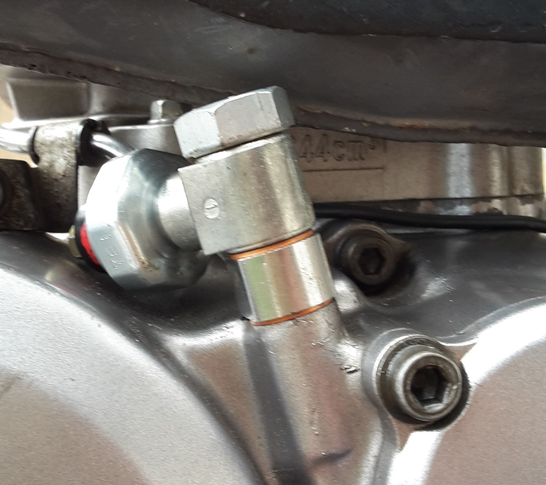 Zur Kontrolle des Öldrucks habe ich mir so einen Druckschalter an den unteren Anschluß der Steigleitung angebaut.