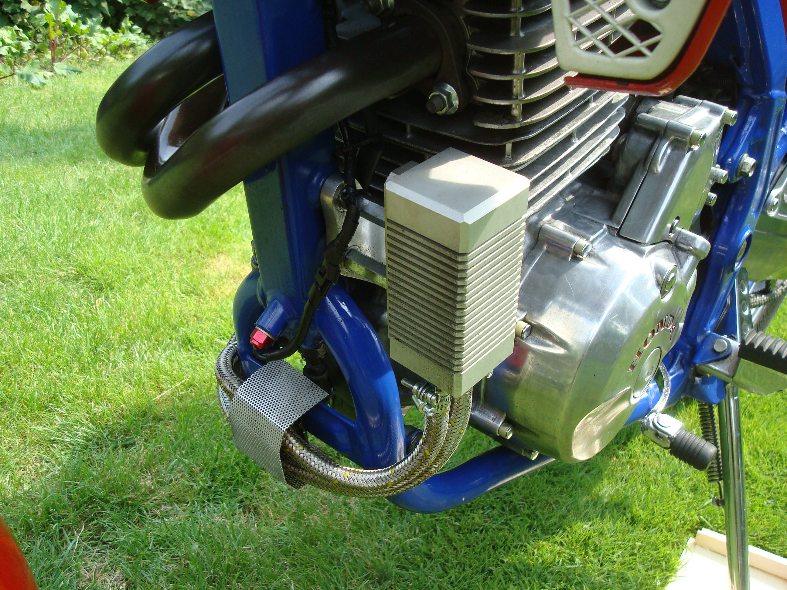 Aus einer SLR den Zylinder genommen und überarbeiten lassen. Kanäle strömungsgünstig optimiert.Der Kolben hat die erste Übergröße und Nocke Stufe 1. Kein Deko mehr. Batterie ist eine Lithium, damit genug Power zum anlassen da ist.