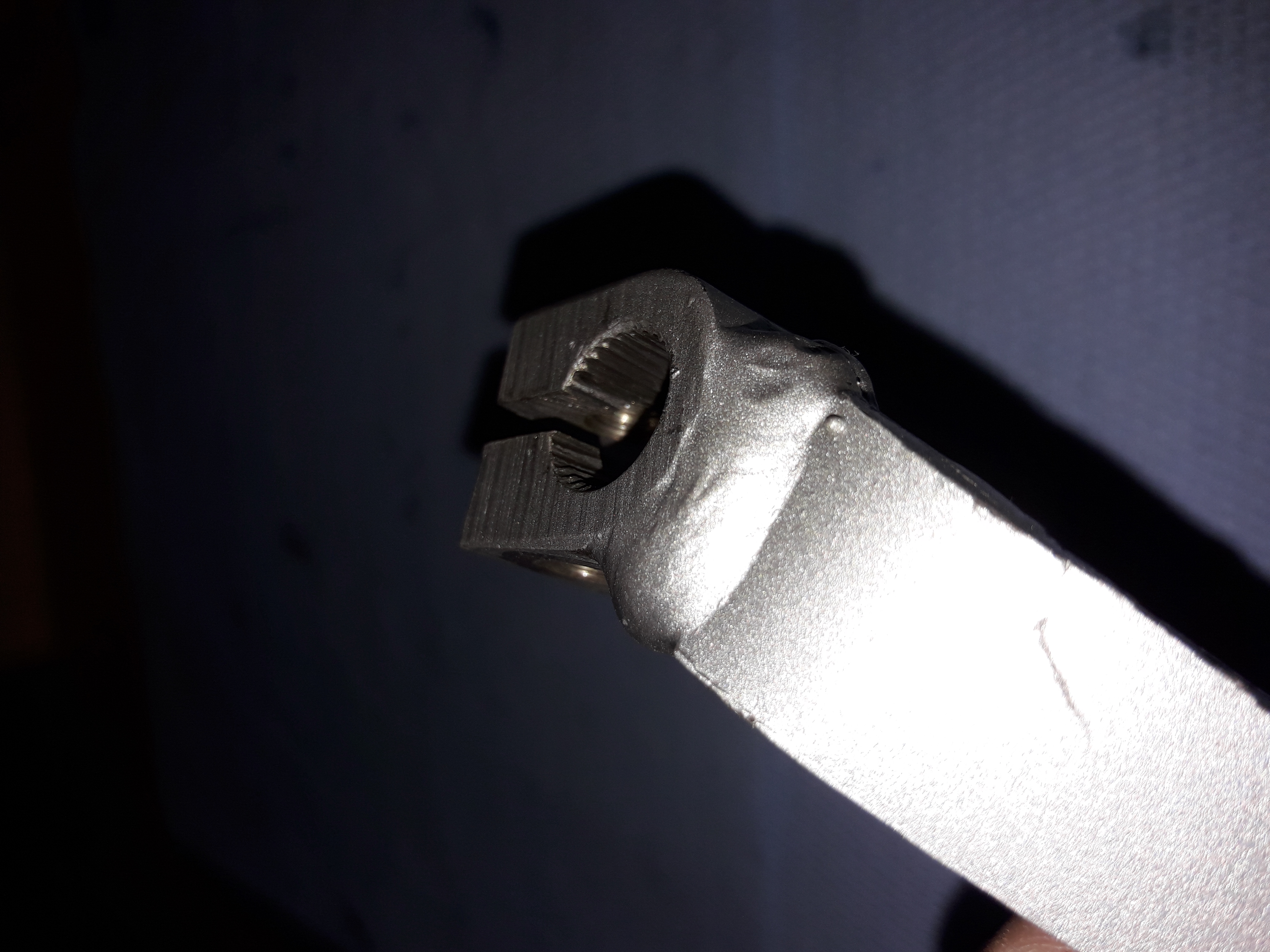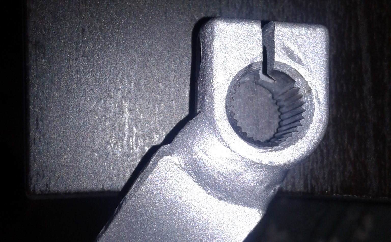 Das würde wieder den Laien in mir ausbrechen lassen und ich würde mal sagen, die Zahnung an der Klemmung hinten, stammt nicht vom Hebel selber und ist abgenudelt sondern der kommt durch ne Pressung von der Welle. Weiter würde ich dann mal vermuten, dass das Material des Hebels allg. etwas weicher ist als das der Welle. Macht ja auch irgendwie sinn, da man die Teile ja "zusammenpressen" will.