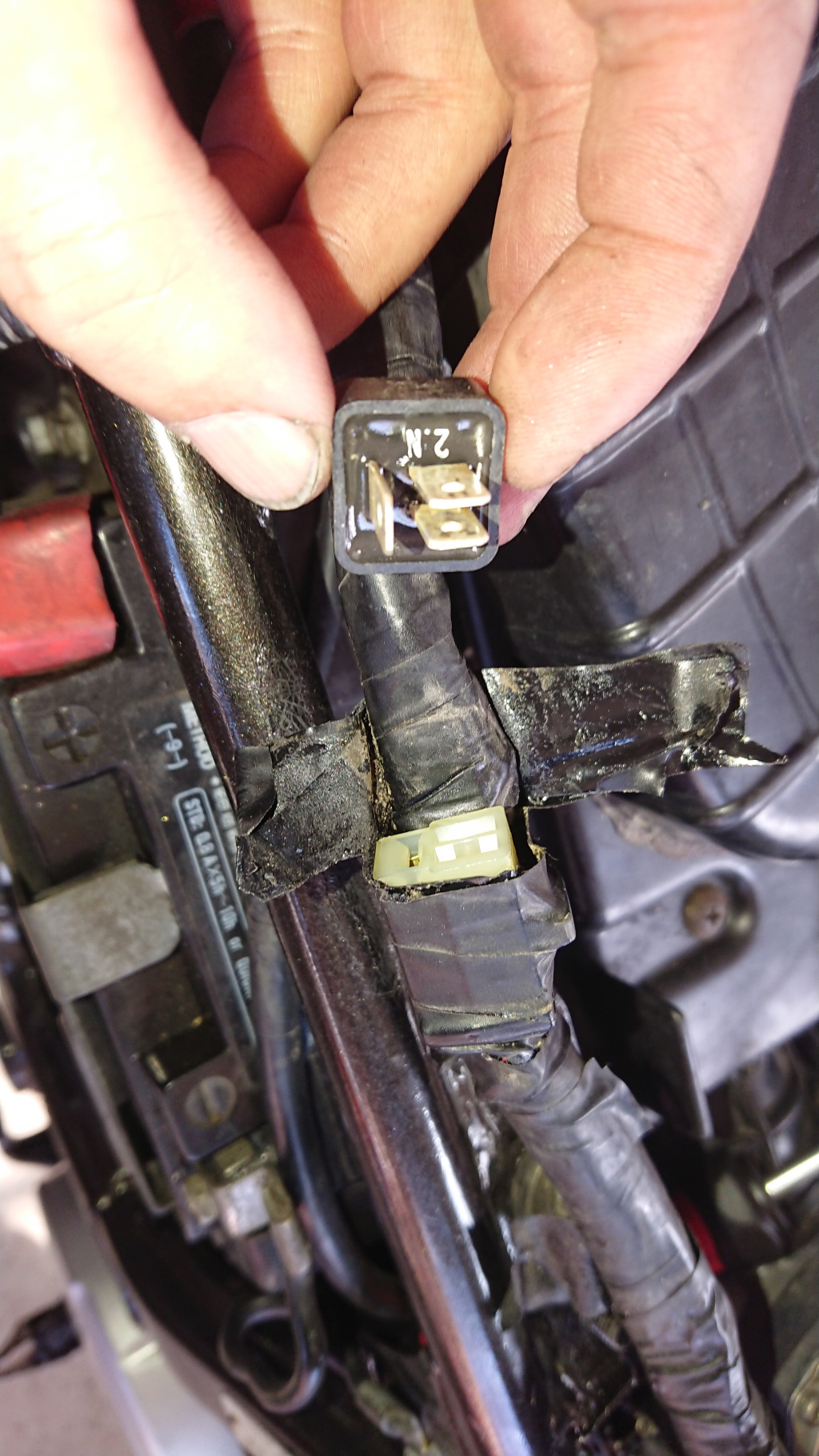 Der Vorbesitzer sagte noch das das Starterrelais nicht mehr original ist und ich hab damals extra ein Foto vom falsch aufgesteckten Stecker gemacht damit beim Zusammenbau nichts schief geht.