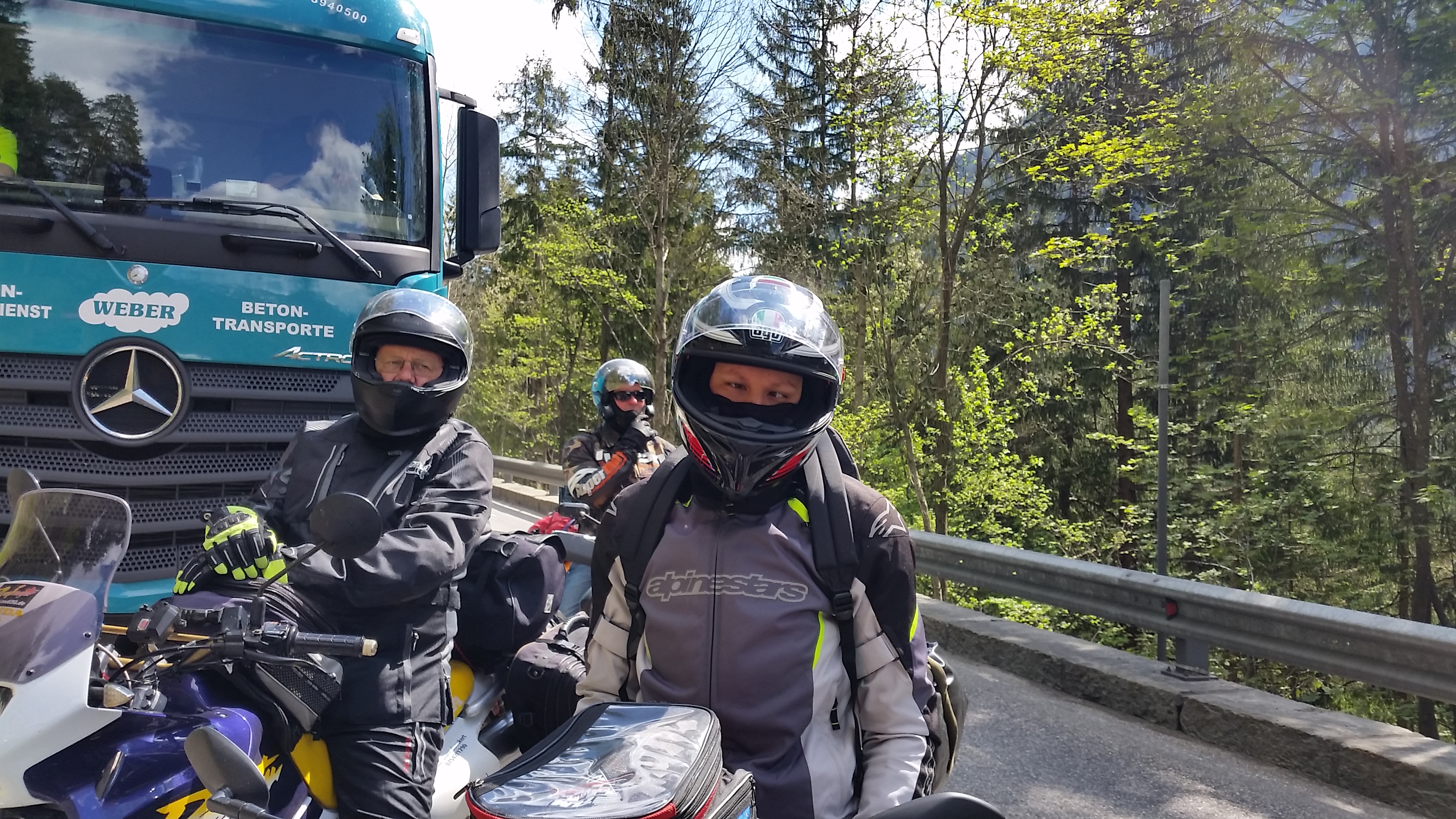 Der Plan sah so aus, daß wir unser Gespann dort stehenlassen und mit den beiden Mopeds Stoppelhopps und PöttPöttPött (CRF 250L) weiterfahren. Aufgrund der schlechten Wettervorhersage (großes Tiefdruckgebiet mit Starkregen) sind wir dann mit dem Gespann weiter gefahren zum Gardasee. Bei bestem Wetter, erst ab Bozen hat es geregnet.