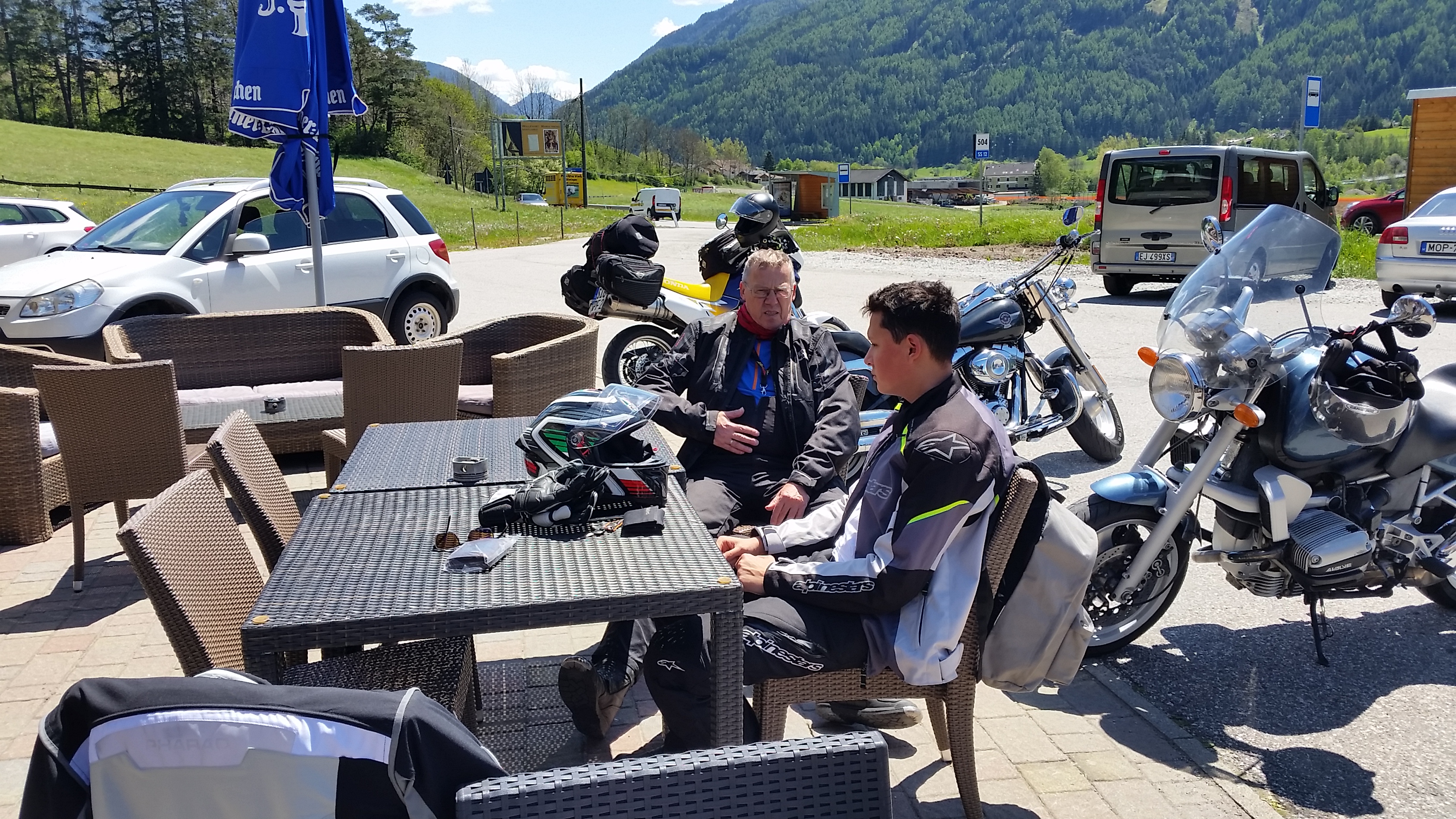 Der Plan sah so aus, daß wir unser Gespann dort stehenlassen und mit den beiden Mopeds Stoppelhopps und PöttPöttPött (CRF 250L) weiterfahren. Aufgrund der schlechten Wettervorhersage (großes Tiefdruckgebiet mit Starkregen) sind wir dann mit dem Gespann weiter gefahren zum Gardasee. Bei bestem Wetter, erst ab Bozen hat es geregnet.