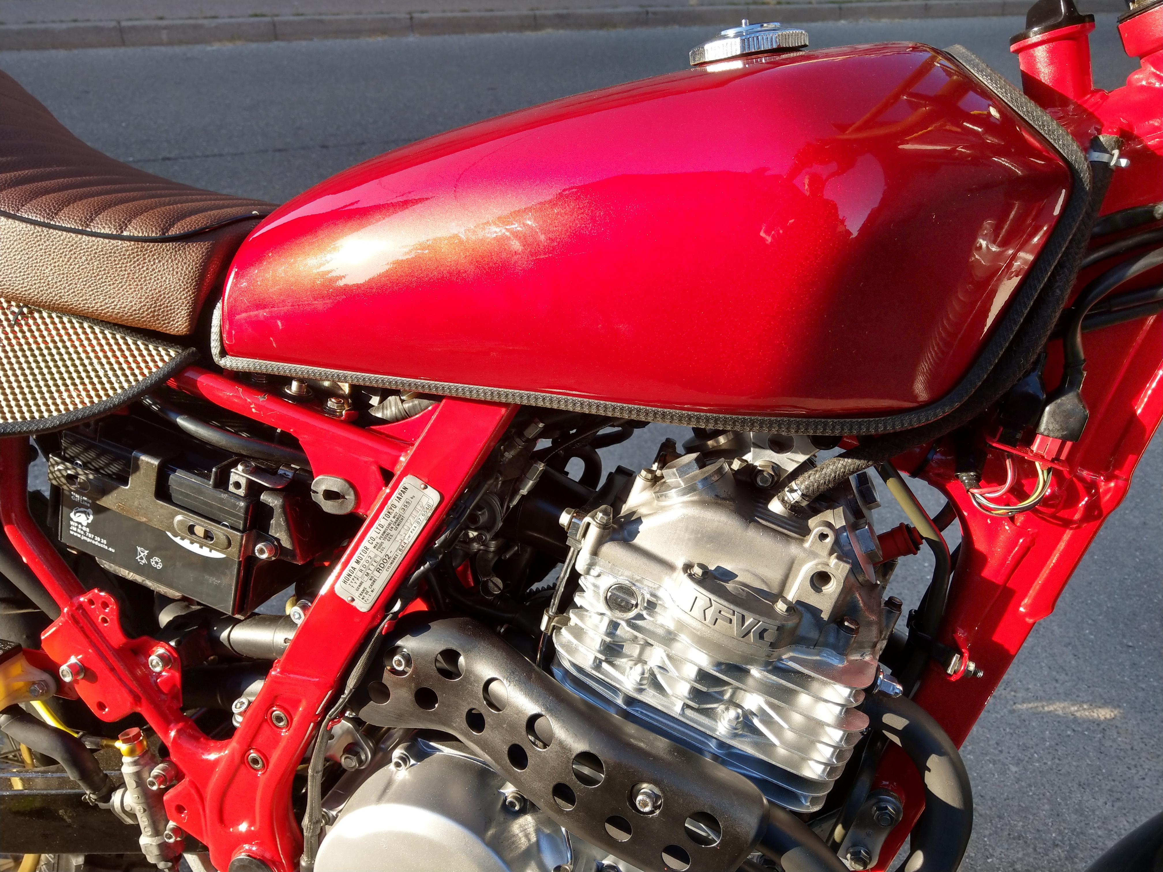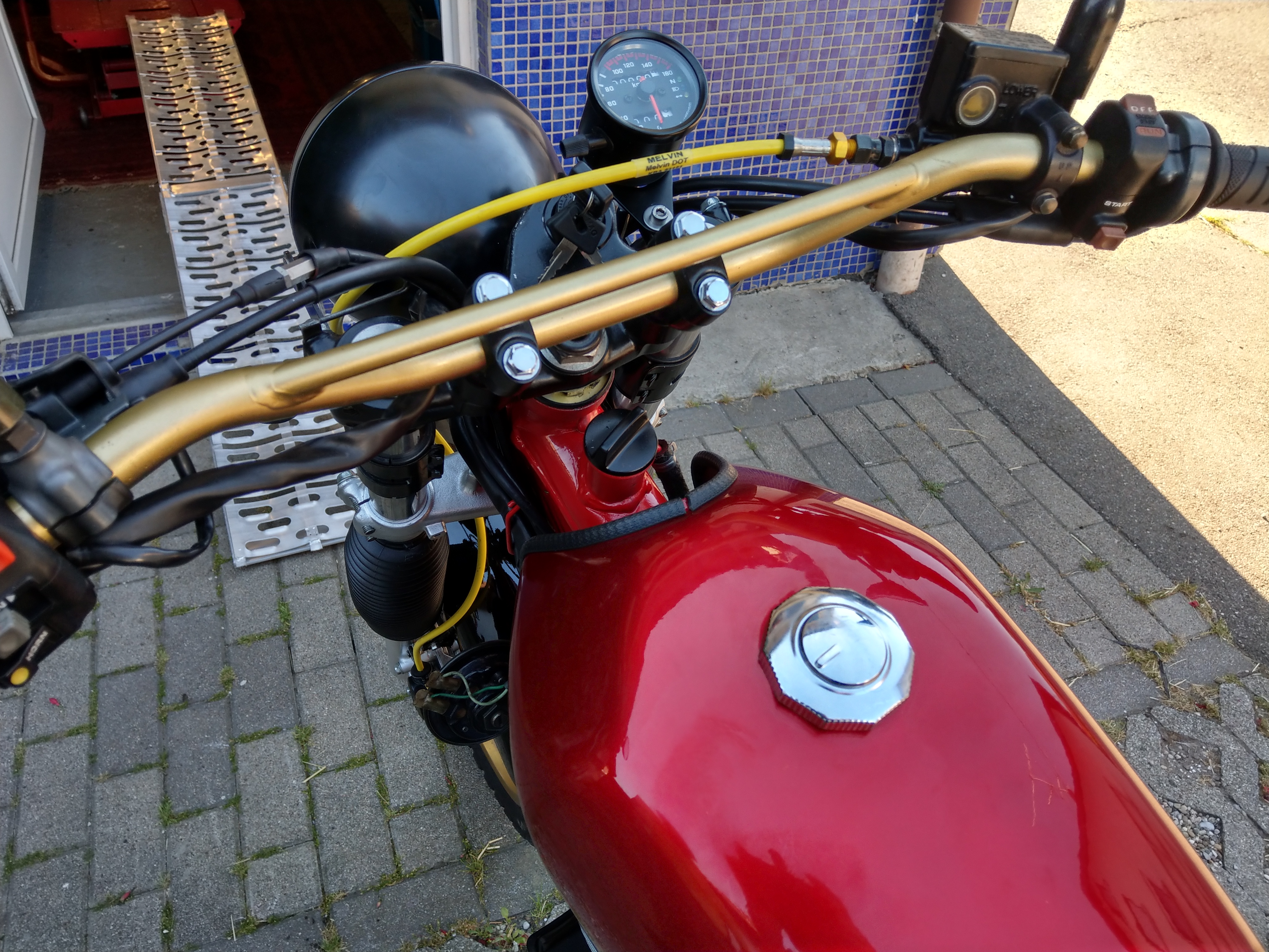 „Wie hast Du das mit der Elektrik gelöst?“ „Wie hast Du die Hitzeschutzbleche gefertigt und woraus?“ „Wie wurde der Tank aufgehängt und die Sitzbank befestigt?“ „Woher stammen die Teile und was kosten sie?“ „Musstest Du etwas am Rahmen ändern?“ (ja) „Wie hoch ist der Gewichtsverlust?“ (fast 20 kg) vor allem: „Was sagt der TÜV dazu?“