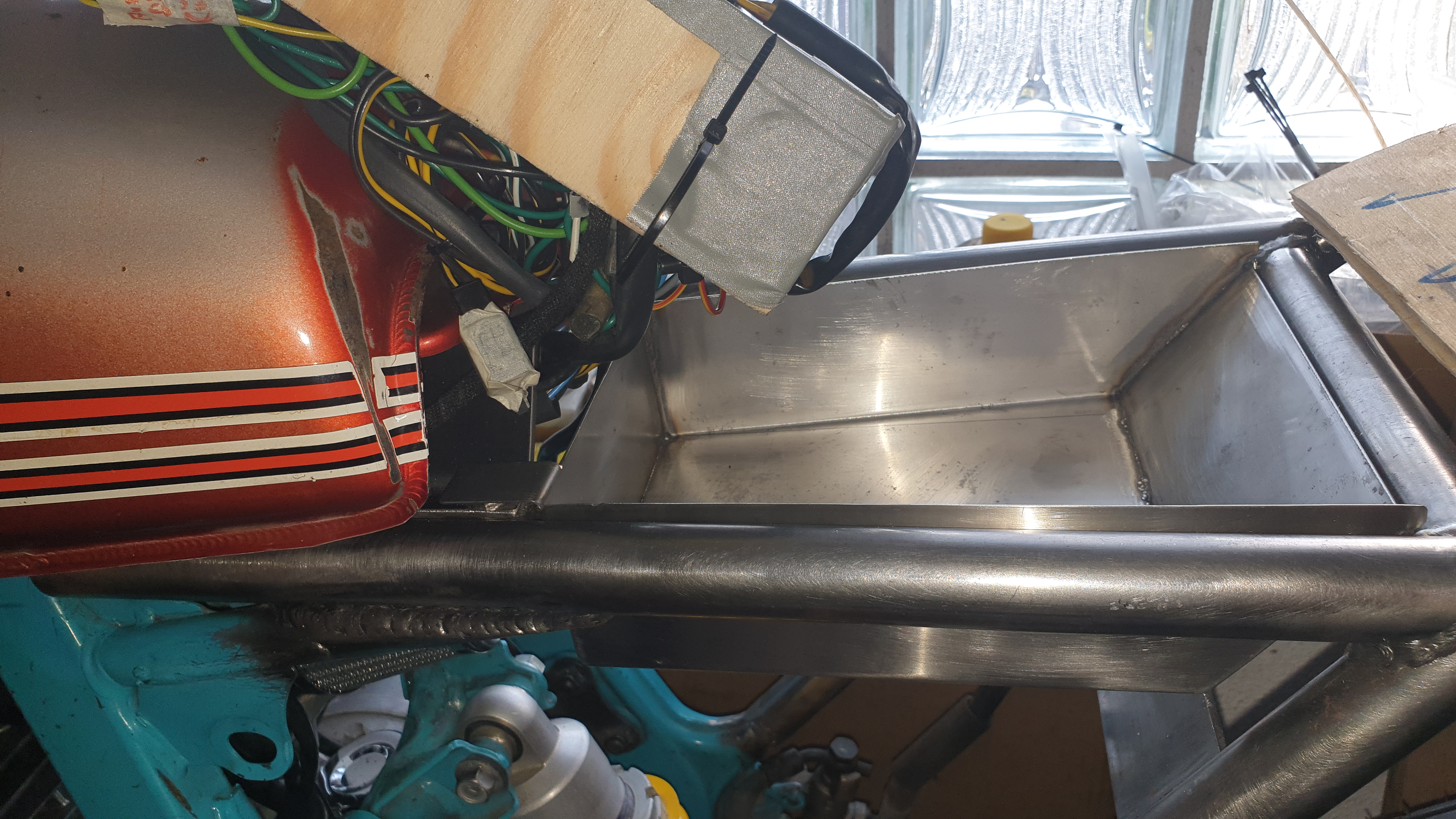 > es wurde der originale Kabelbaum verwendet und einfach auf Höhe des Zylinderkopfes wieder nach hinten gelegt. Die Umwicklungen wurden aufgetrennt und alle unnötigen Kabel eingekürzt. In der nun noch zu erstellenden "Elektrikschublade" (aus Edelstahlblech) unter der Sitzbank/ganz oben im ansonsten leeren Rahmendreieck werden Autoelektrik-Stecker für den wasserdichten Kontakt eingebracht, die Kabel dann wieder passend in Schrumpfschlauch und schwarzem Textilklebeband zusammengefasst