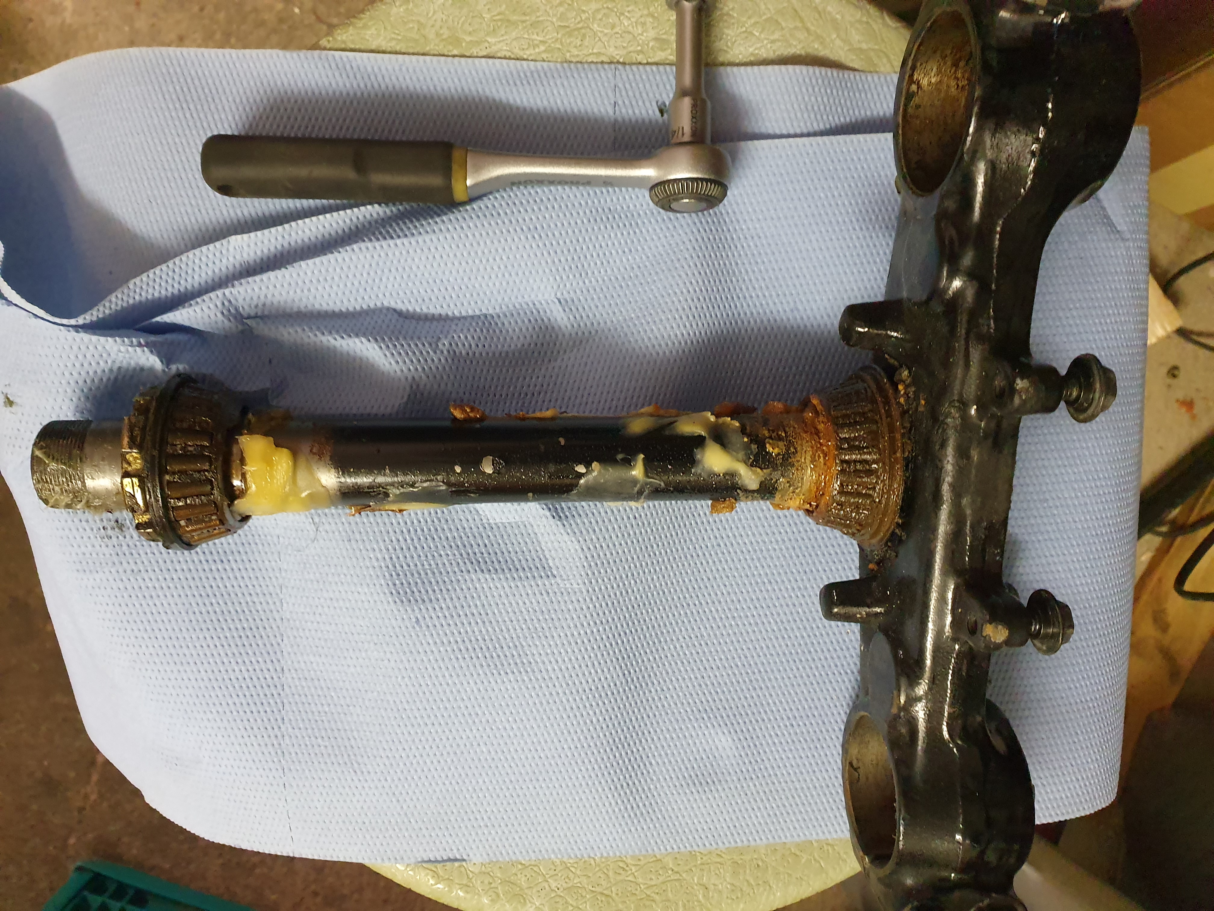 Dann noch das Lenkkopflager erneuert. War auch höchste Zeit und einen Gabelservice gleich hinterher. Langsam wird es. Freu mich schon auf den Zusammenbau.