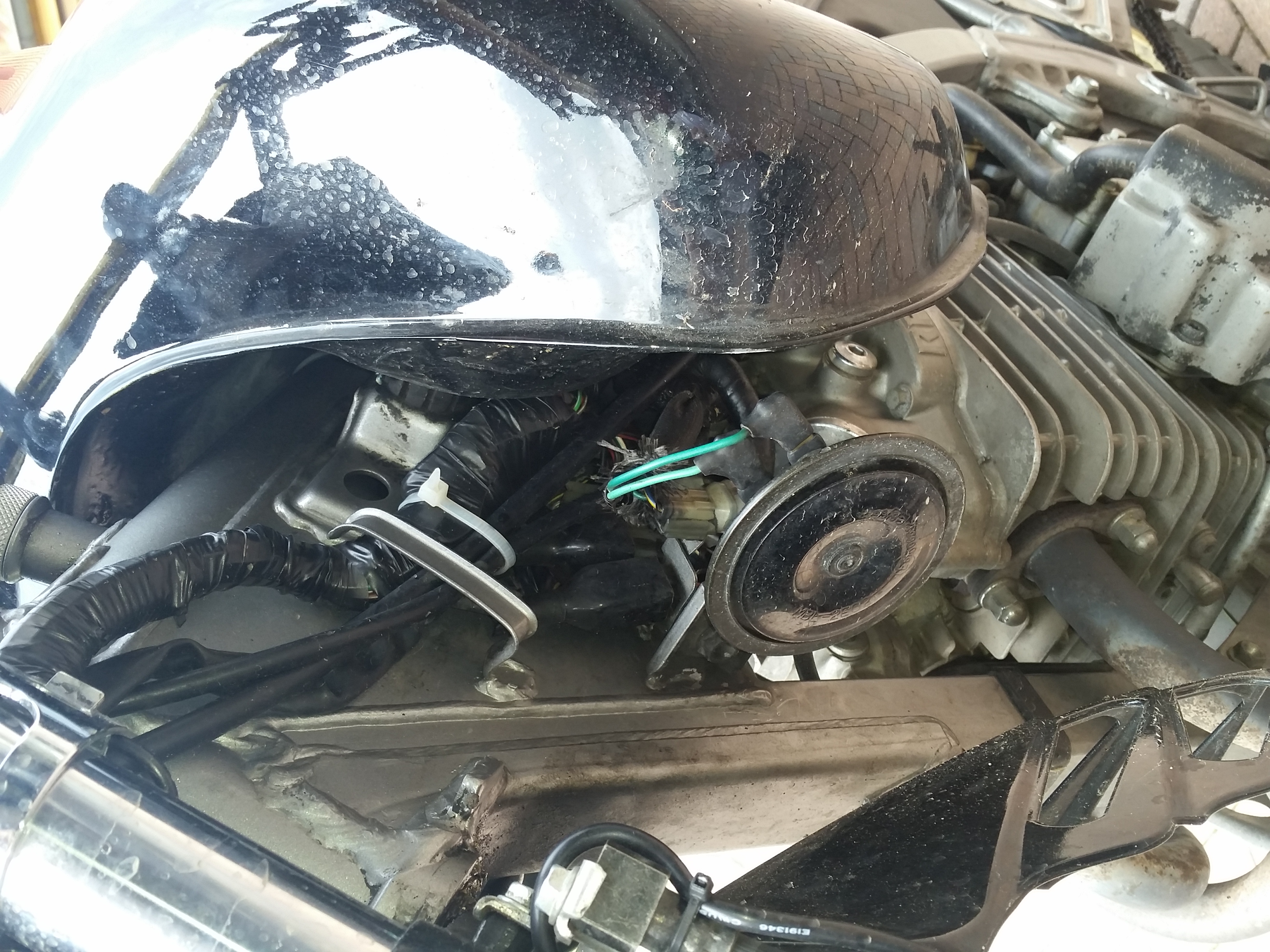 Blinkerrelais, Sicherungskasten und CDI sitzen ja vorne in der Verkleidungins da die Verkleidung weg ist, wurde die Teile unterm Tank befestigt, Kabelbaum ist aber der originale.