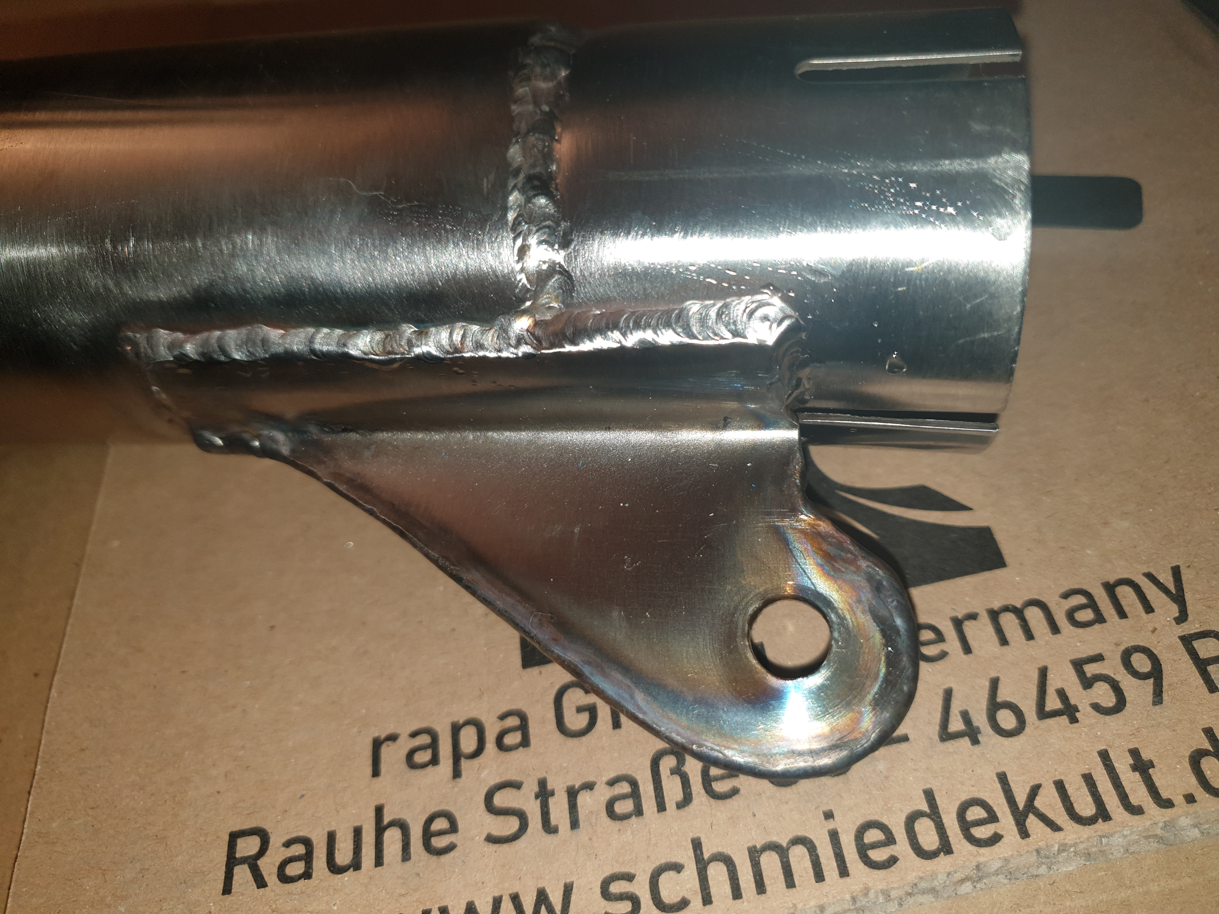 > „Haifischflosse“ gebaut, aus 2Winkeln geschweisst, angepasst und am Abgasmittelrohr angeschweisst
