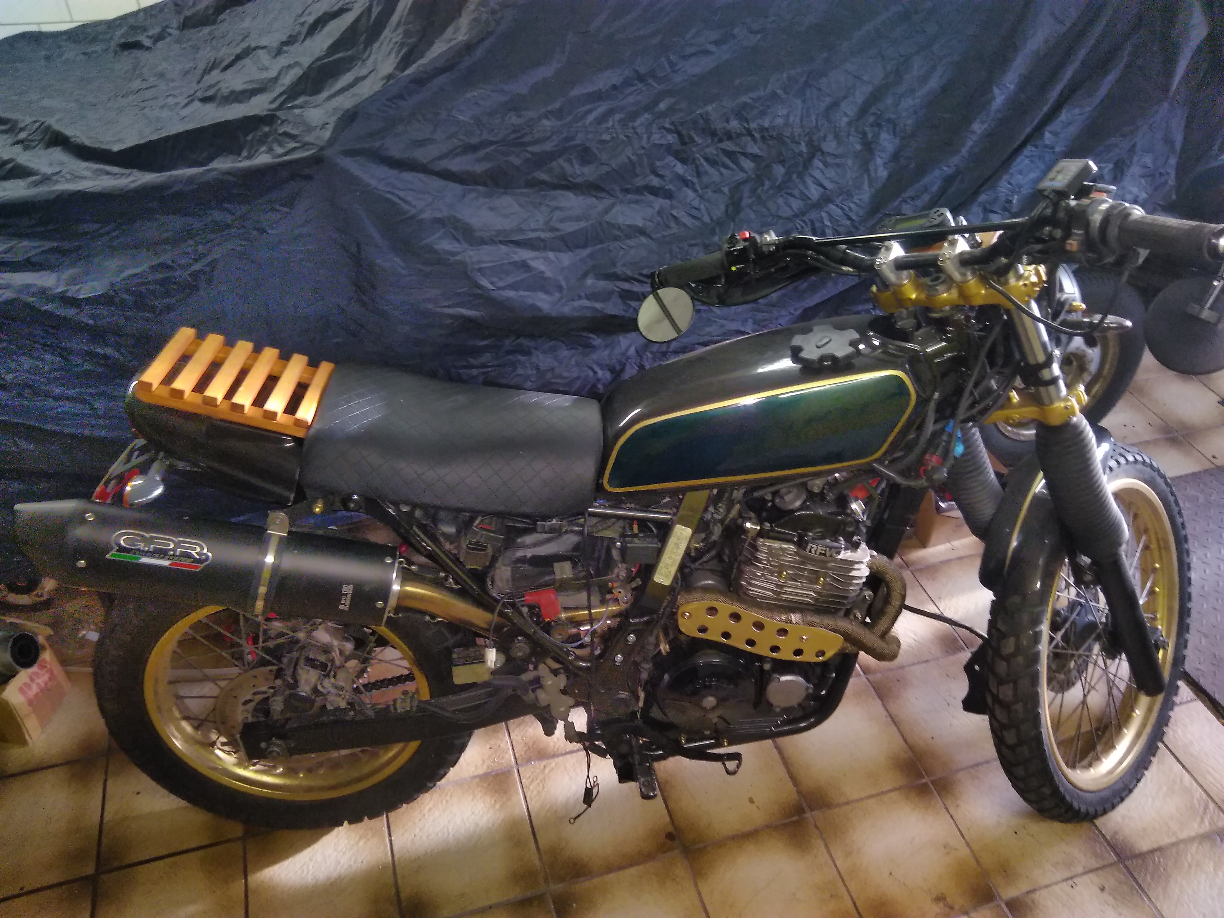 So Männers, wie versprochen Unten ein paar Zwischenstands Bilder. Lenker habe ich gestern noch vom Schwarz entfernt, blank geschliffen und klar lackiert. Hat mir besser gefallen da es besser zum "Steel" Bike passt. Heute Abend stehen dann nur die Montage des Mini Tachos an. Diese Woche sollten dann weiterhin und hoffentlich die restlichen Teile eintreffen somit am kommenden Samstag eine kleine Testfahrt gemacht warden könnte:
